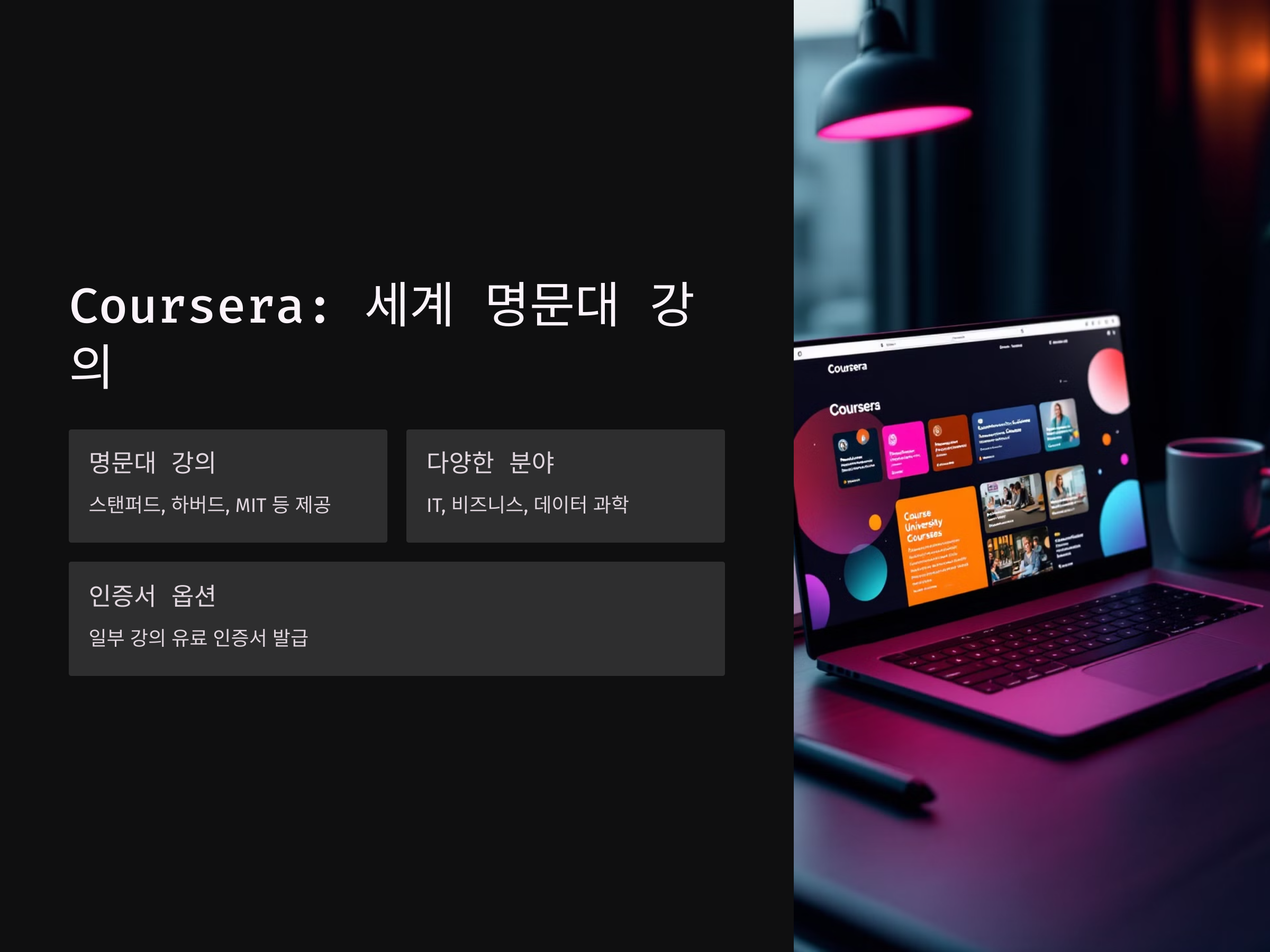 Coursera는 스탠퍼드, 하버드, MIT 등 세계적인 명문 대학과 기업이 제공하는 강의를 무료로 수강할 수 있는 플랫폼입니다. IT, 비즈니스, 데이터 과학 등 다양한 분야의 강의를 제공하며, 일부 강의는 유료 인증서 발급도 가능합니다. 예를 들어, 'Python for Everybody'와 같은 강좌는 프로그래밍 입문자에게 큰 도움이 됩니다.