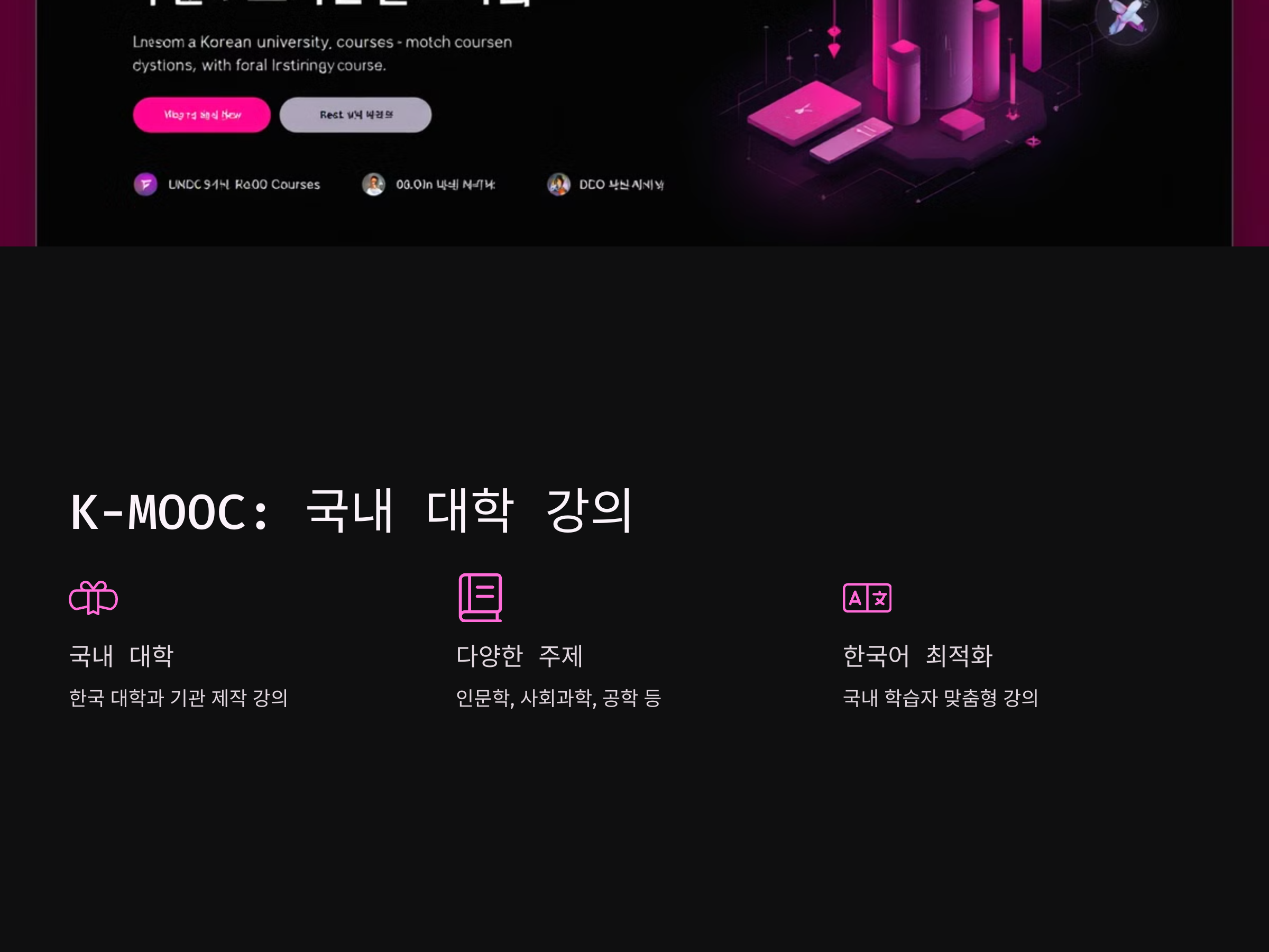 K-MOOC는 한국형 온라인 공개강좌 서비스로, 국내 대학과 기관에서 제작한 다양한 주제의 강의를 제공합니다. 인문학, 사회과학, 공학 등 다양한 분야의 강의를 무료로 수강할 수 있으며, 한국어로 진행되어 국내 학습자들에게 최적화되어 있습니다.