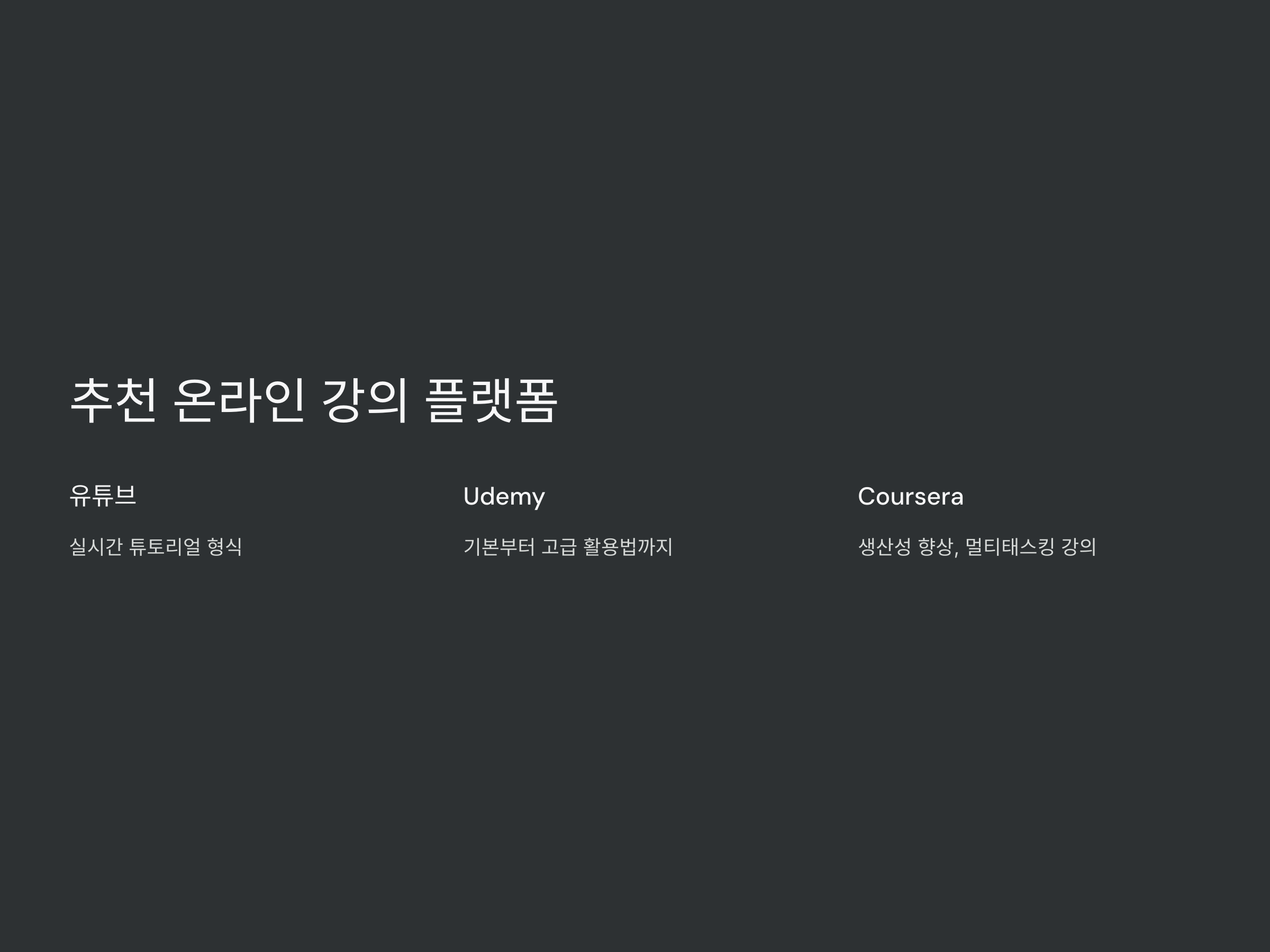 이러한 플랫폼들은 각자 다른 스타일로 강의를 제공하므로, 자신에게 맞는 강의를 선택하여 수강할 수 있습니다. 예를 들어, 유튜브는 실시간 튜토리얼 형식으로 쉽게 배울 수 있지만, Udemy와 Coursera는 더 체계적인 강의와 커리큘럼을 제공합니다.