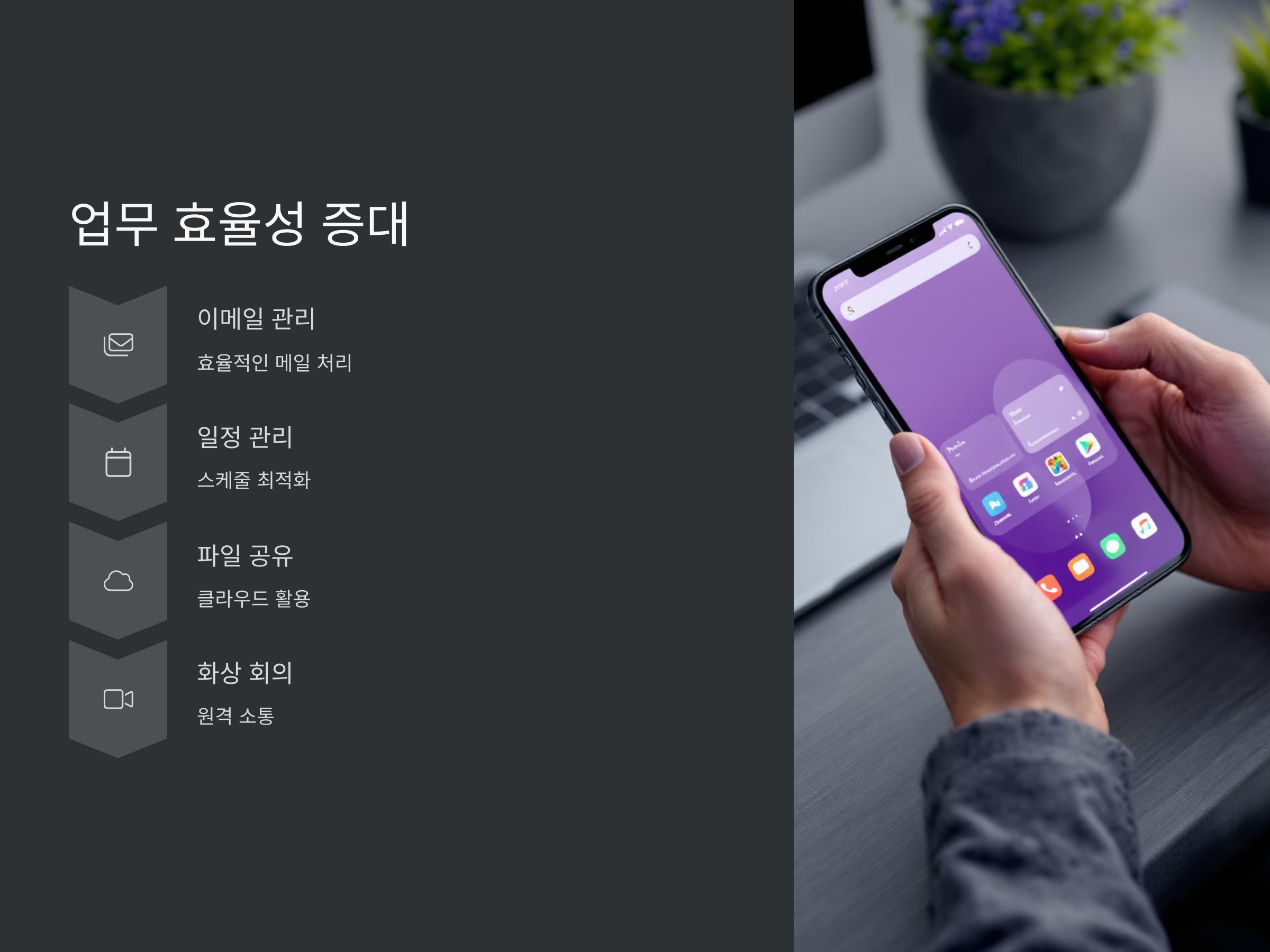 스마트폰은 그 자체로 강력한 업무 도구가 될 수 있습니다. 이메일 관리, 일정 관리, 파일 공유, 팀 협업 등 여러 가지 업무를 스마트폰을 통해 간편하게 처리할 수 있습니다. 예를 들어, 구글 드라이브나 OneDrive를 사용하여 클라우드에서 파일을 관리하고, Trello나 Asana 같은 앱을 이용해 프로젝트를 관리할 수 있습니다.
