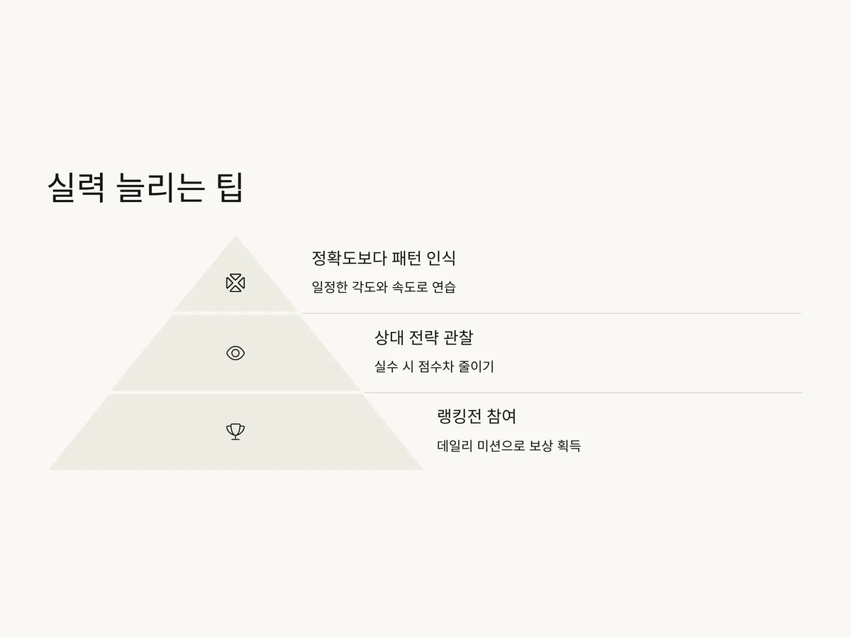 실력 있는 유저들의 공통된 조언은 ‘정확도보다 패턴 인식’에 집중하라는 것입니다. 초보자일수록 같은 각도와 속도로 다트를 던지는 연습이 중요하며, 터치 조작 게임의 경우 일정한 드래그 속도와 방향을 습관화하면 성공률이 높아집니다.