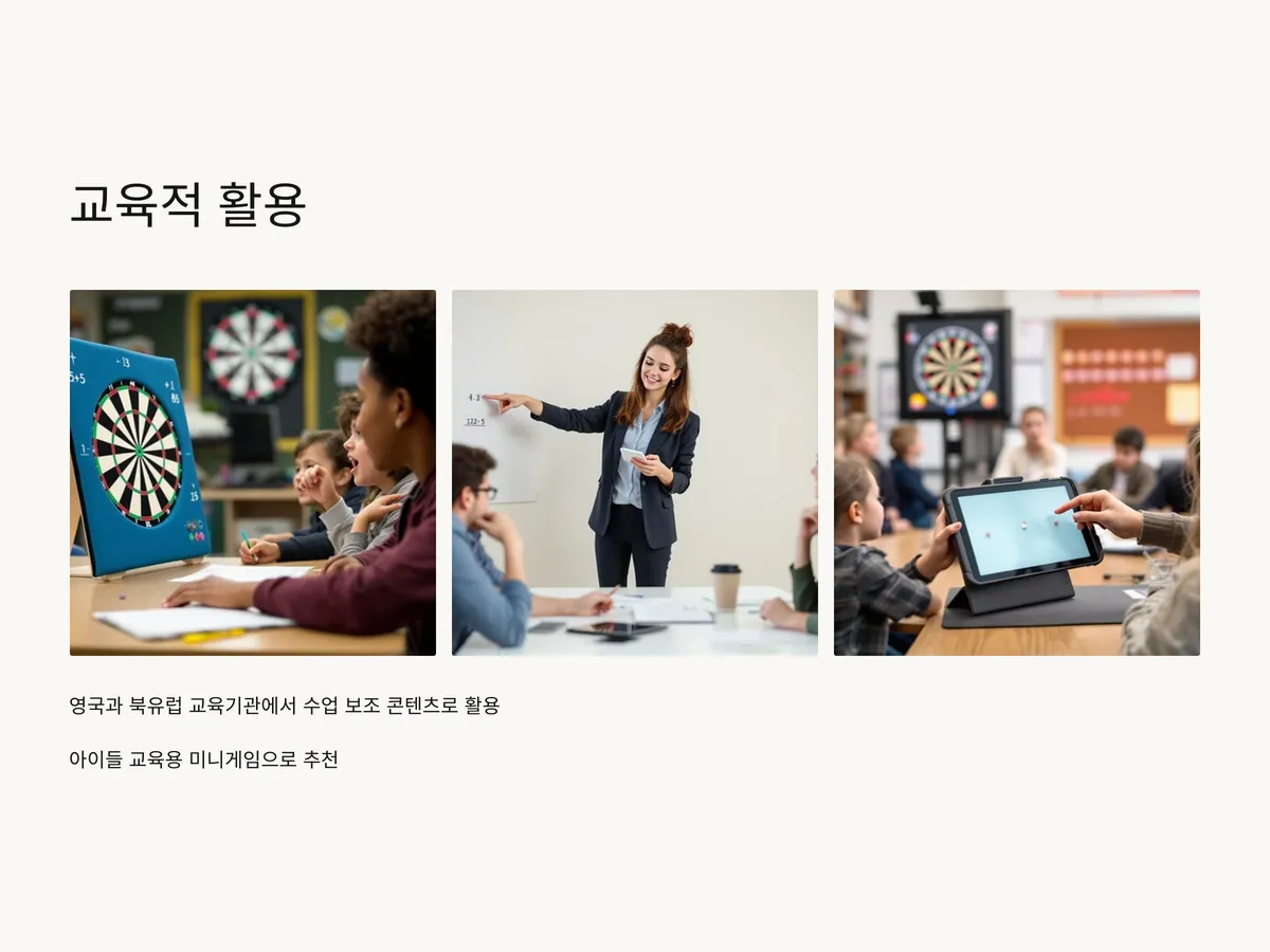게임을 하며 재미뿐 아니라 집중력, 반사 신경, 계산 능력까지 향상시킬 수 있다는 점에서 아이들 교육용 미니게임으로도 추천되고 있습니다. 실제로 영국과 북유럽의 일부 교육기관에서는 온라인 다트 게임을 수업 보조 콘텐츠로 활용하기도 합니