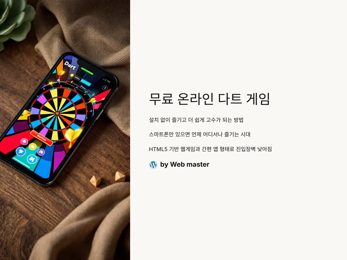 다트 게임을 꼭 설치해야 한다는 고정관념은 이제 버려야 합니다. 요즘에는 HTML5 기반의 웹 다트 게임들이 많아, 별도의 설치 없이 웹 브라우저만으로도 바로 게임을 즐길 수 있습니다. 특히 Crazy Dart, Darts King Online, Dart Challenge 2025 같은 인기 게임들은 모바일, PC, 태블릿 어디서든 접속만 하면 즉시 플레이 가능하다는 장점이 있습니다.