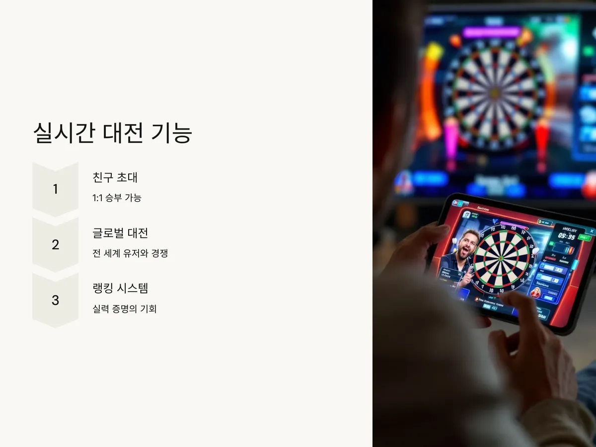 요즘 인기 있는 다트 게임은 단순히 점수만 내는 구조에서 벗어나, 실시간 멀티플레이 기능을 적극 활용하고 있습니다. 특히 Darts of Fury와 같은 앱은 친구 초대 기능을 통해 친구와 1:1로 승부를 벌이거나, 전 세계 유저와 대전을 펼칠 수 있는 기능을 제공합니다.