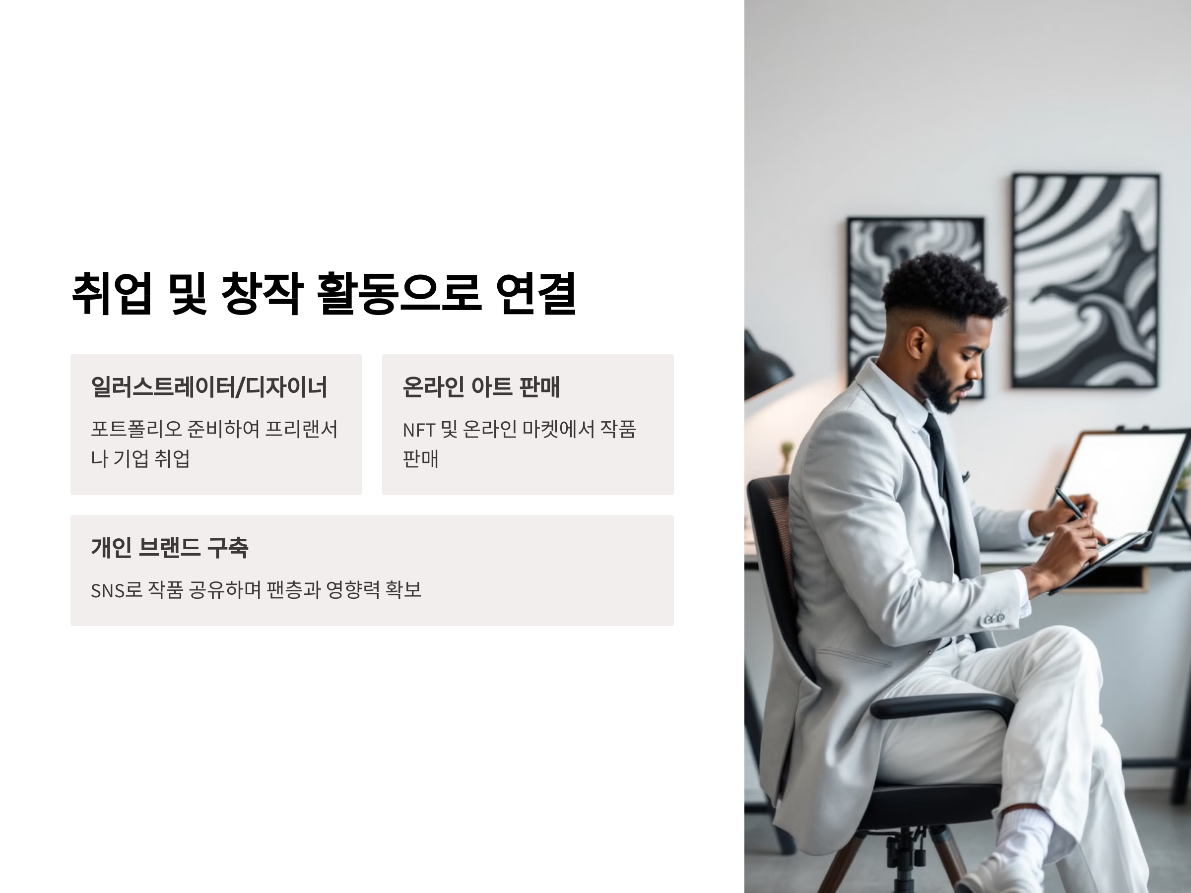 - 일러스트레이터, 디자이너로 취업: 포트폴리오를 준비하여 프리랜서나 기업 취업에 도전할 수 있습니다.