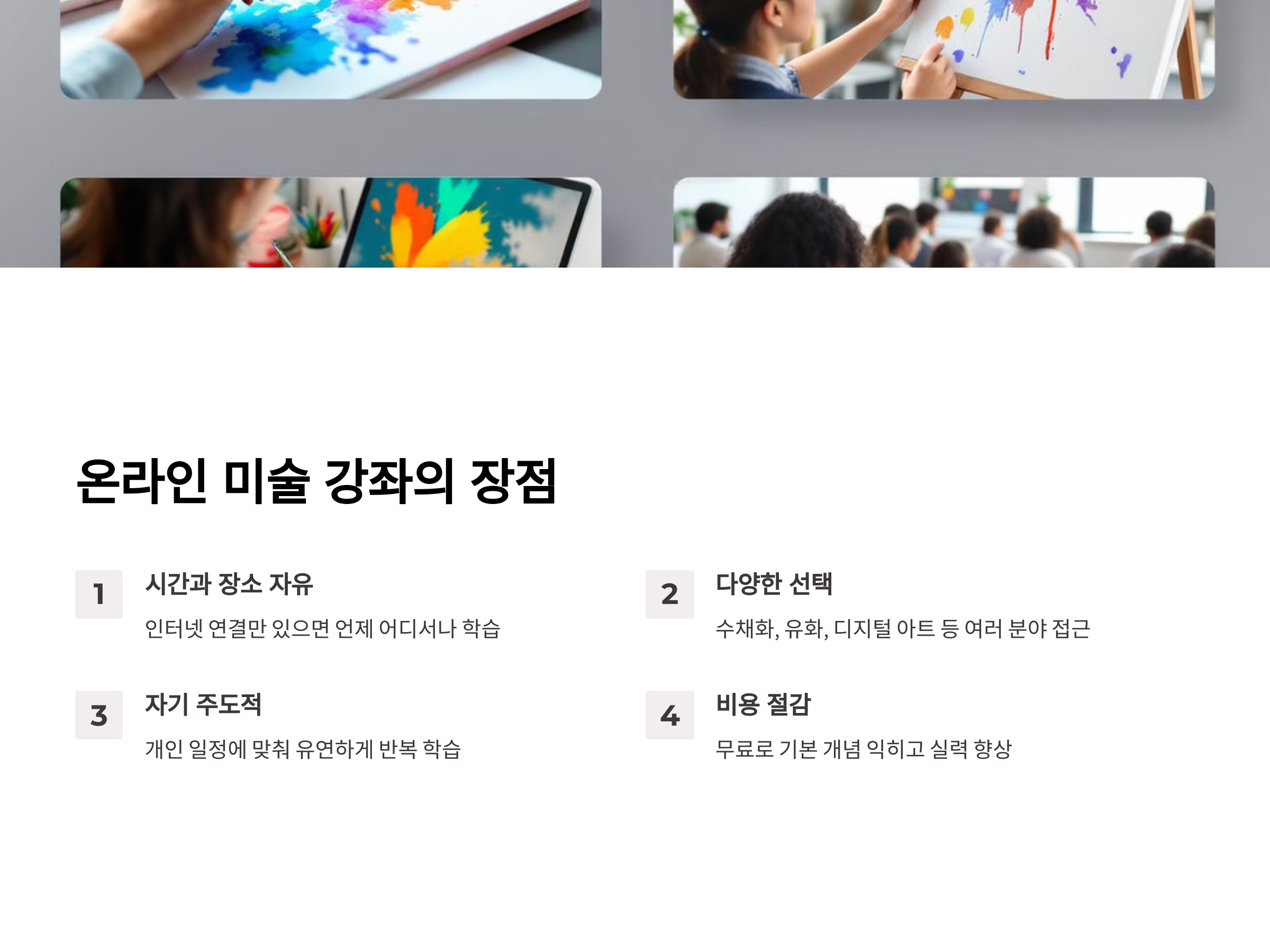- 다양한 강의 선택 가능: 수채화, 유화, 디지털 아트 등 여러 분야의 미술을 접할 수 있습니다.