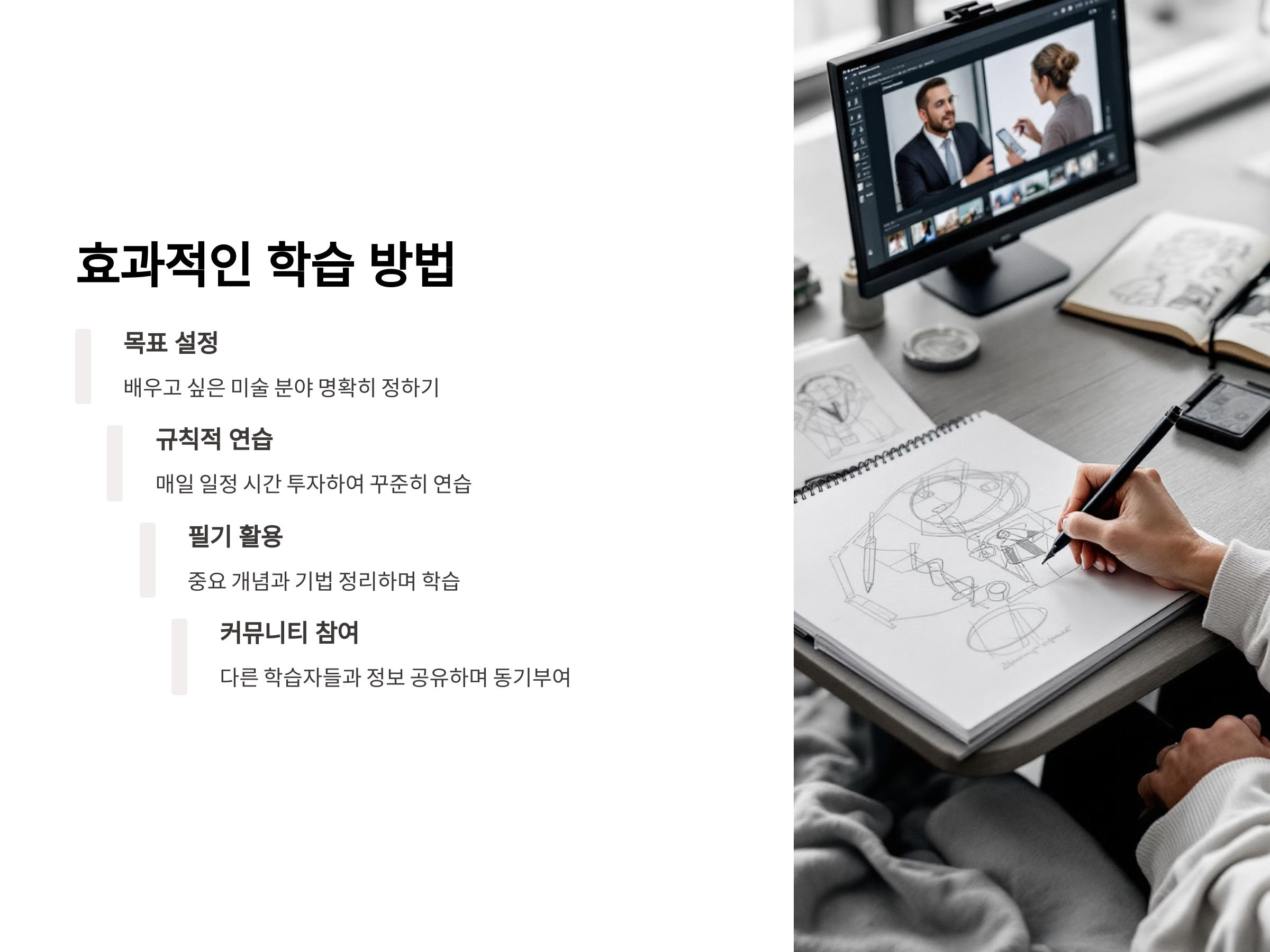 - 목표 설정: 어떤 분야의 미술을 배우고 싶은지 명확히 정하는 것이 중요합니다.