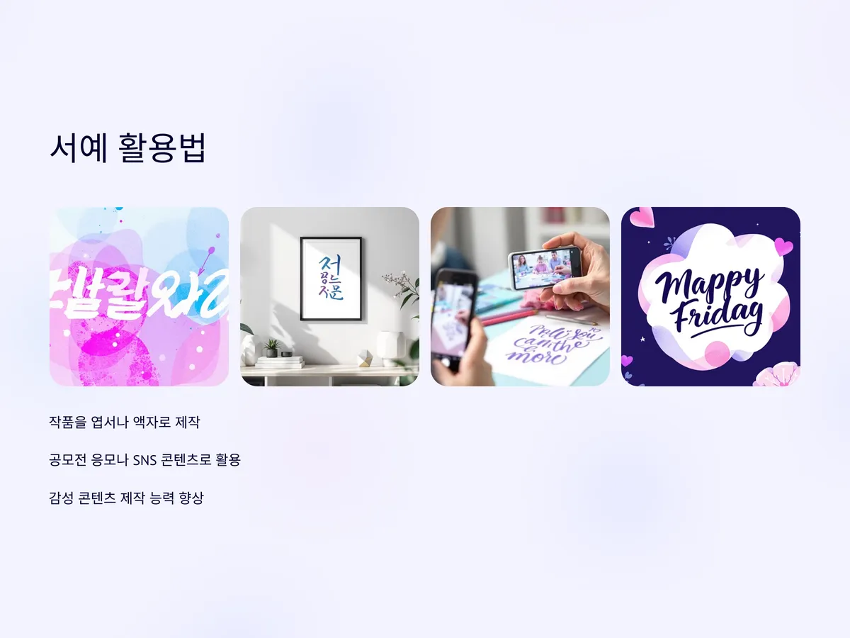 또한 수강 후 완성된 작품은 캘리그래피 엽서나 액자로 제작해 선물용으로 활용할 수 있으며, 공모전에 응모하거나 SNS 콘텐츠로 제작해 자신의 포트폴리오로도 활용 가능합니다. 특히 프리랜서 디자이너나 크리에이터에게는 감성 콘텐츠 제작 능력 향상에 큰 도움이 될 수 있습니다.