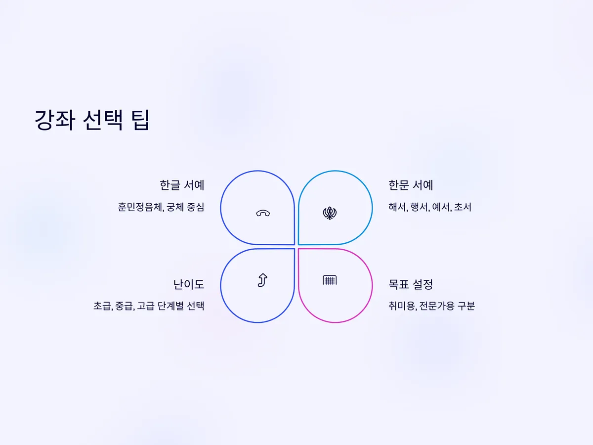 서예 강좌를 선택할 때는 자신이 어떤 서체를 배우고 싶은지, 목표가 무엇인지 명확히 하는 것이 중요합니다. 예를 들어, 한글 서예에 관심 있다면 ‘훈민정음체’나 ‘궁체’ 중심의 강좌를, 전통 한문 서예에 관심 있다면 ‘해서’, ‘행서’ 등의 강좌를 선택하는 것이 좋습니다.