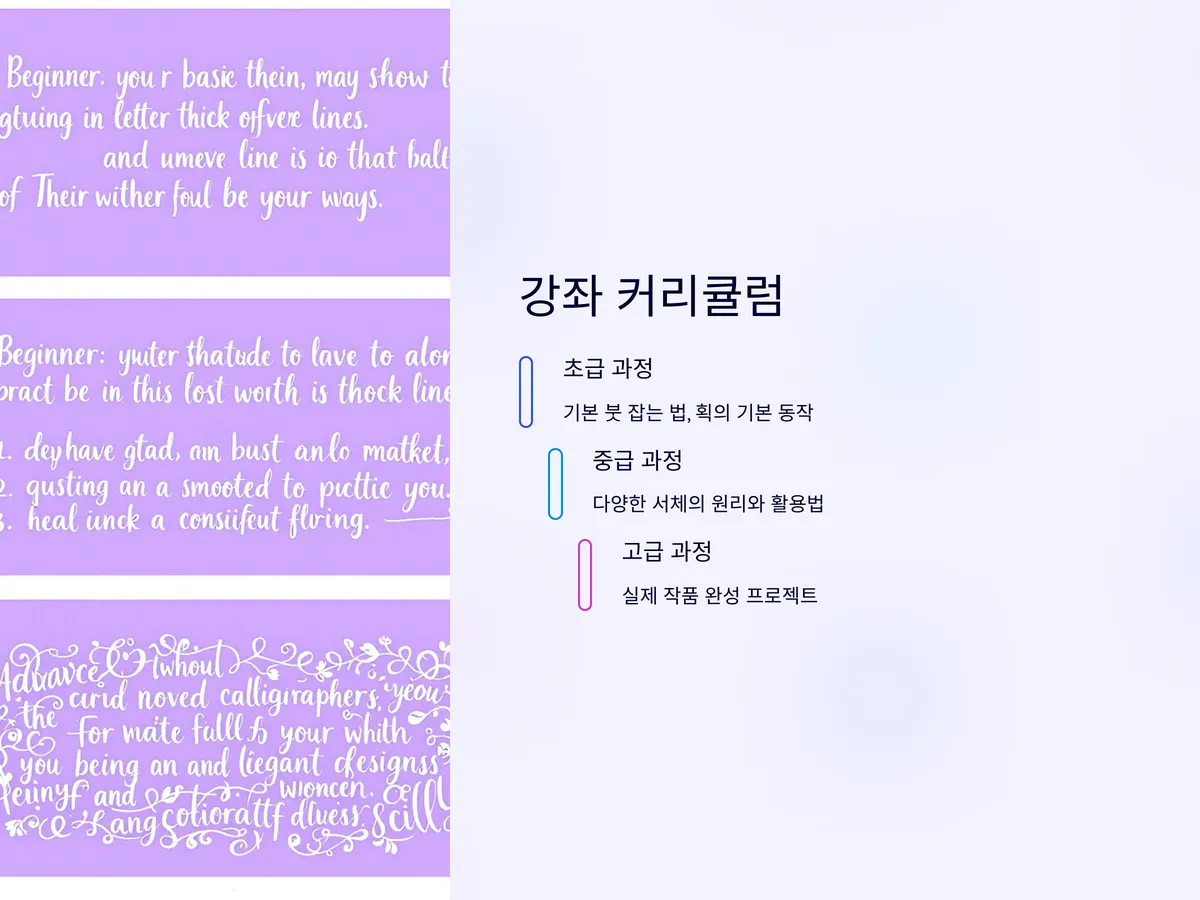 대부분의 온라인 서예 강좌는 초급부터 중급, 고급까지 단계별로 구성되어 있습니다. 초급 강좌에서는 기본 붓 잡는 법, 획의 기본 동작, 기본 한자 혹은 한글 쓰기 등을 배웁니다. 중급 이상에서는 행서, 예서, 초서와 같은 다양한 서체의 원리와 활용법을 익히며, 실제 작품을 완성하는 프로젝트도 포함됩니다.
