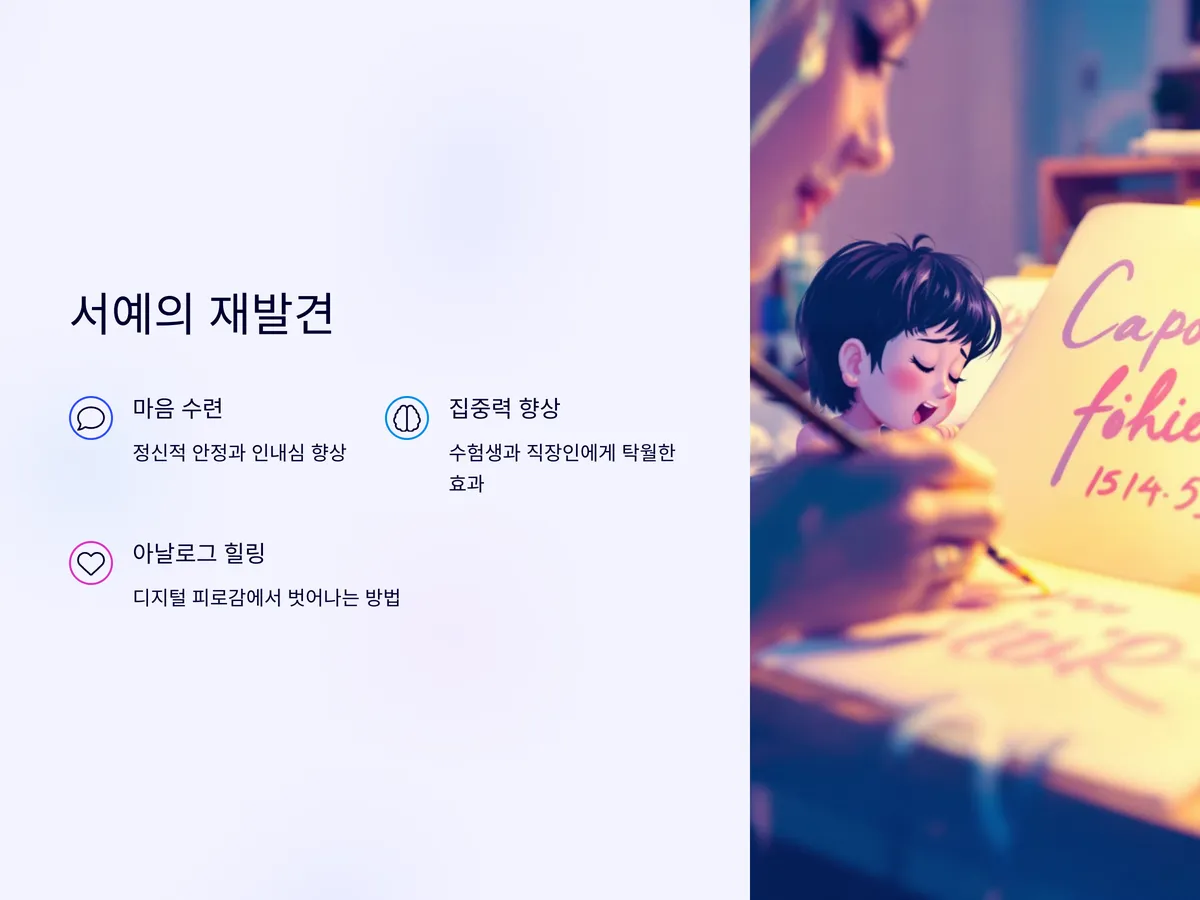 서예는 단순히 예쁜 글씨를 쓰는 것이 아니라, 마음을 다스리고 호흡을 조절하며 인내심을 기르는 수련의 과정입니다. 코로나19 이후 많은 사람들이 정신적 안정을 찾기 위해 예술 활동에 관심을 가지기 시작하면서 서예의 수요가 급증했는데, 이는 디지털 피로감에서 벗어나 아날로그적 힐링을 추구하는 현대인의 흐름을 반영합니다.