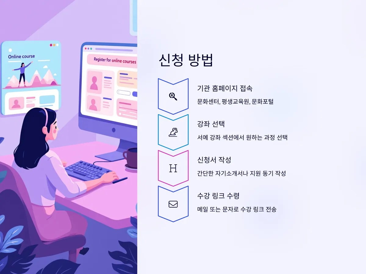 신청 방법은 간단합니다. 각 기관의 홈페이지에 접속하여 서예 강좌 섹션을 클릭한 후, 원하는 강좌를 선택하고 수강 신청 버튼을 누르면 됩니다. 수강 신청 시 간단한 자기소개서나 지원 동기를 작성하는 경우도 있으며, 수강신청 완료 후 일정에 따라 메일 또는 문자로 수강 링크가 전송됩니다.