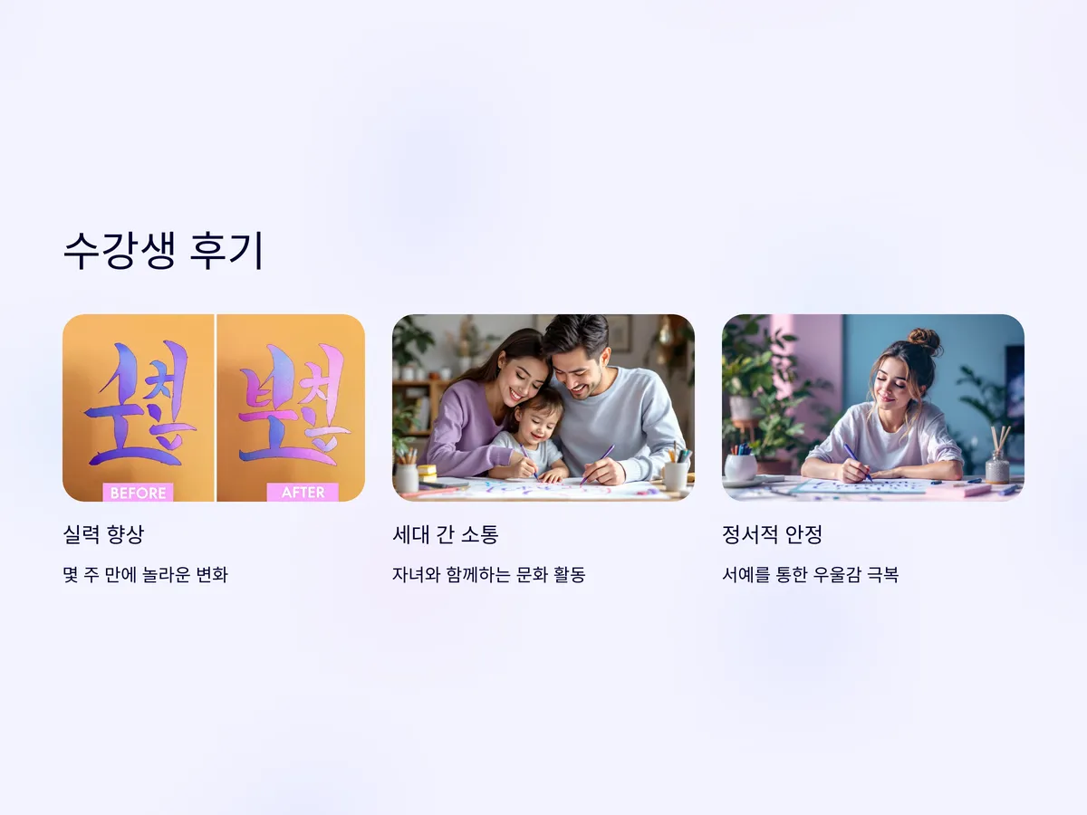 또한 자녀와 함께 강의를 수강하며 세대 간 소통이 이루어졌다는 후기, 서예를 통해 우울감을 극복했다는 경험담 등, 단순한 취미 활동을 넘어 삶의 변화를 느꼈다는 반응들이 이어지고 있습니다. 이처럼 서예는 단순한 기술 습득 이상의 가치를 지니며, 삶의 질을 높여주는 중요한 요소로 자리잡고 있습니다.