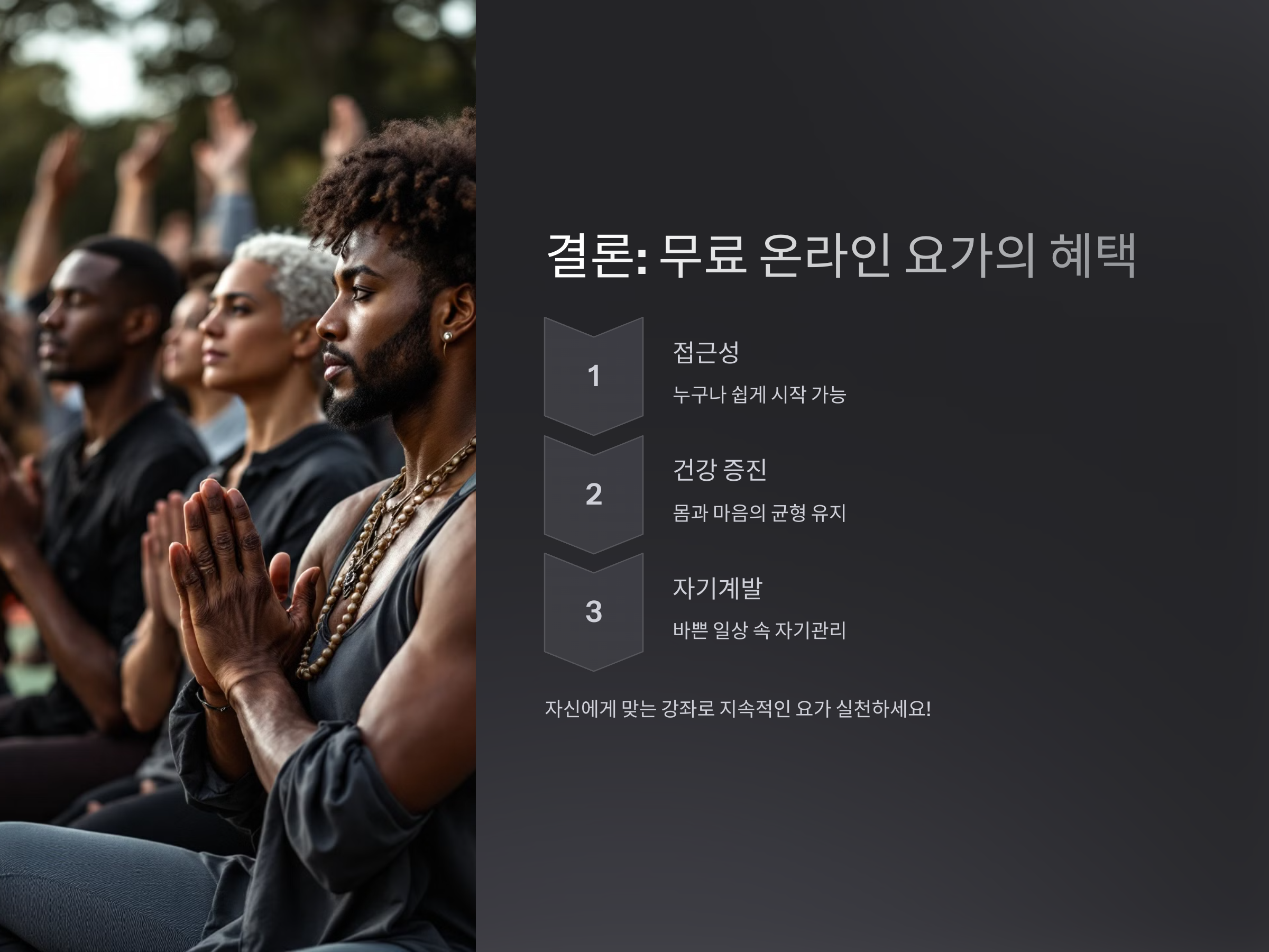 무료 온라인 요가 강좌는 누구나 쉽게 접근할 수 있는 훌륭한 자기계발 방법 중 하나입니다. 다양한 플랫폼에서 제공되는 무료 강좌를 잘 활용하면 바쁜 일상 속에서도 건강한 몸과 마음을 유지할 수 있습니다. 중요한 것은 꾸준한 연습과 올바른 자세 유지입니다. 자신에게 맞는 강좌를 찾아 지속적으로 실천해 보세