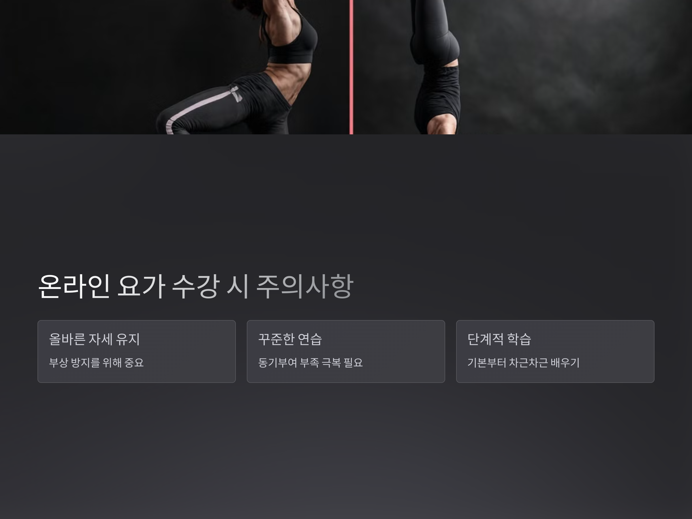 - "요가 초보자 강좌"부터 시작하여 점차 중급, 고급 강좌로 넘어가는 것이 좋습니다.