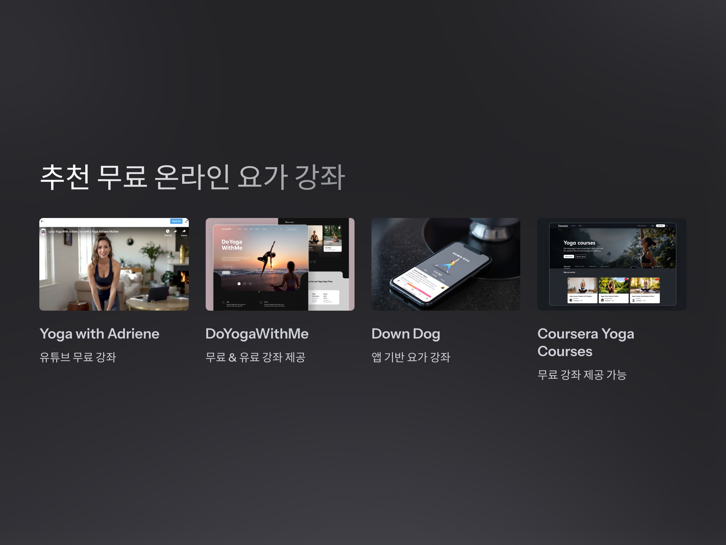 - 모바일 앱 (Down Dog, Daily Yoga, Yoga for Beginners 등)