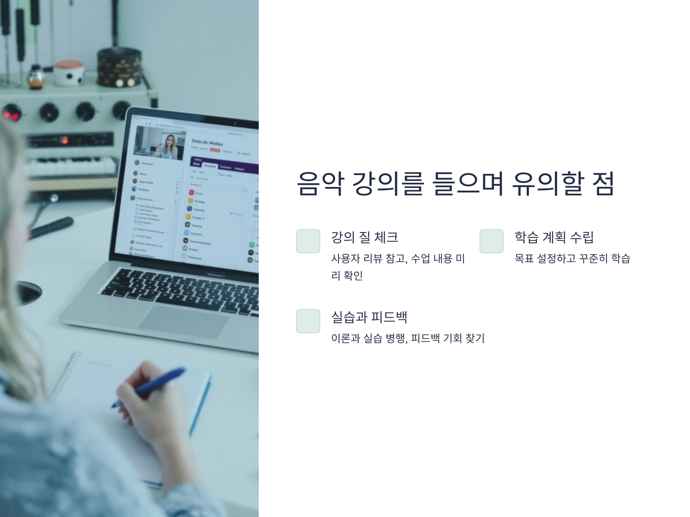 - Udemy: 유료 강의가 많지만, 종종 할인 및 무료 강의를 제공합니다. 다양한 음악 분야의 강의를 찾아볼 수 있습니다.