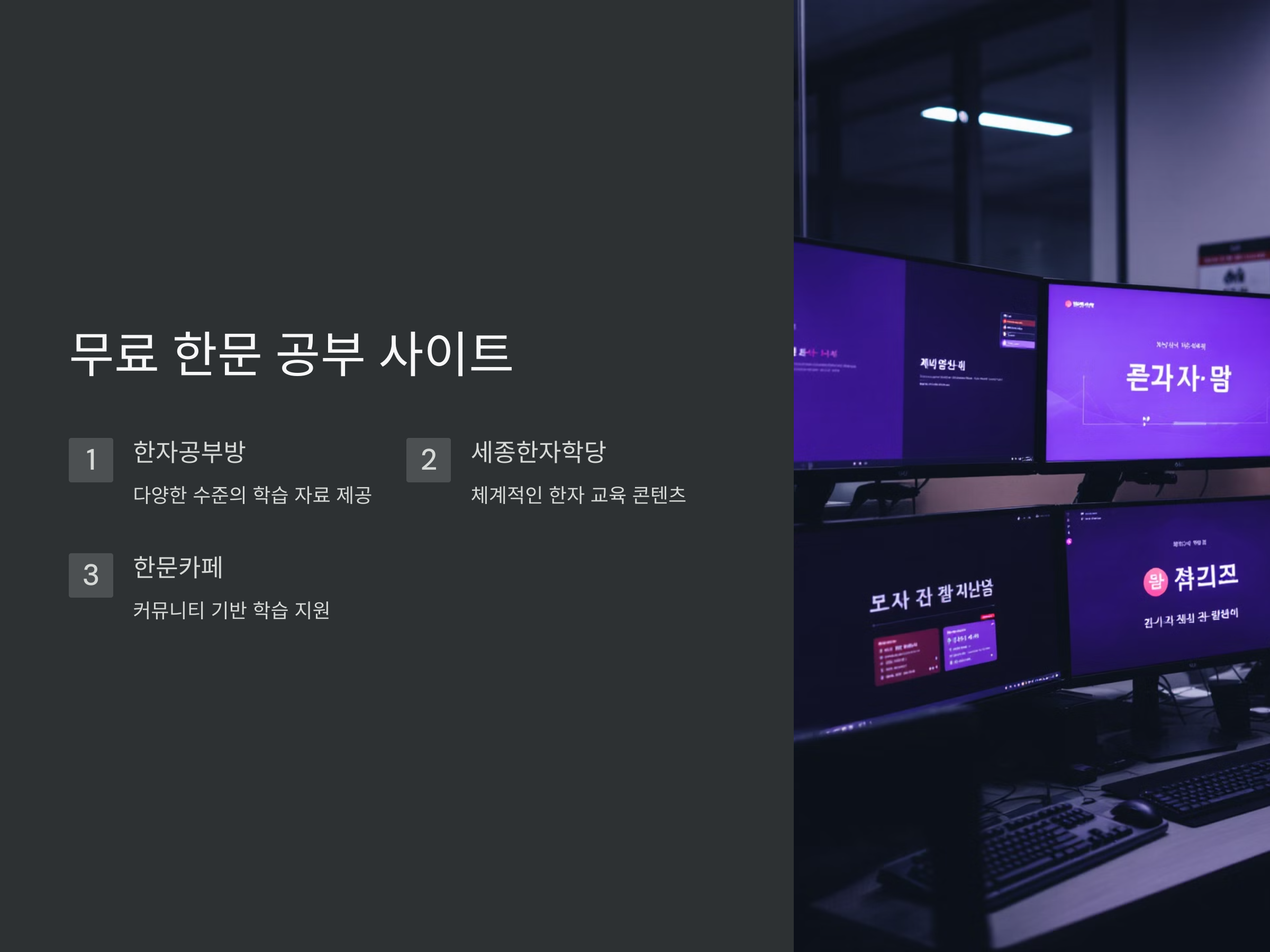 한문은 깊이 있는 공부가 필요한 과목이지만, 온라인에서 제공되는 다양한 무료 학습 자료와 사이트를 통해 효율적으로 배울 수 있습니다. 한자를 배우는 데 있어 가장 중요한 것은 꾸준히 공부하고, 반복적인 학습을 통해 자연스럽게 익히는 것입니다. 위에서 소개한 사이트와 학습법을 통해 한문 공부를 시작해보세요. 한문을 배우는 재미와 성취감을 느낄 수 있을 것입니다.