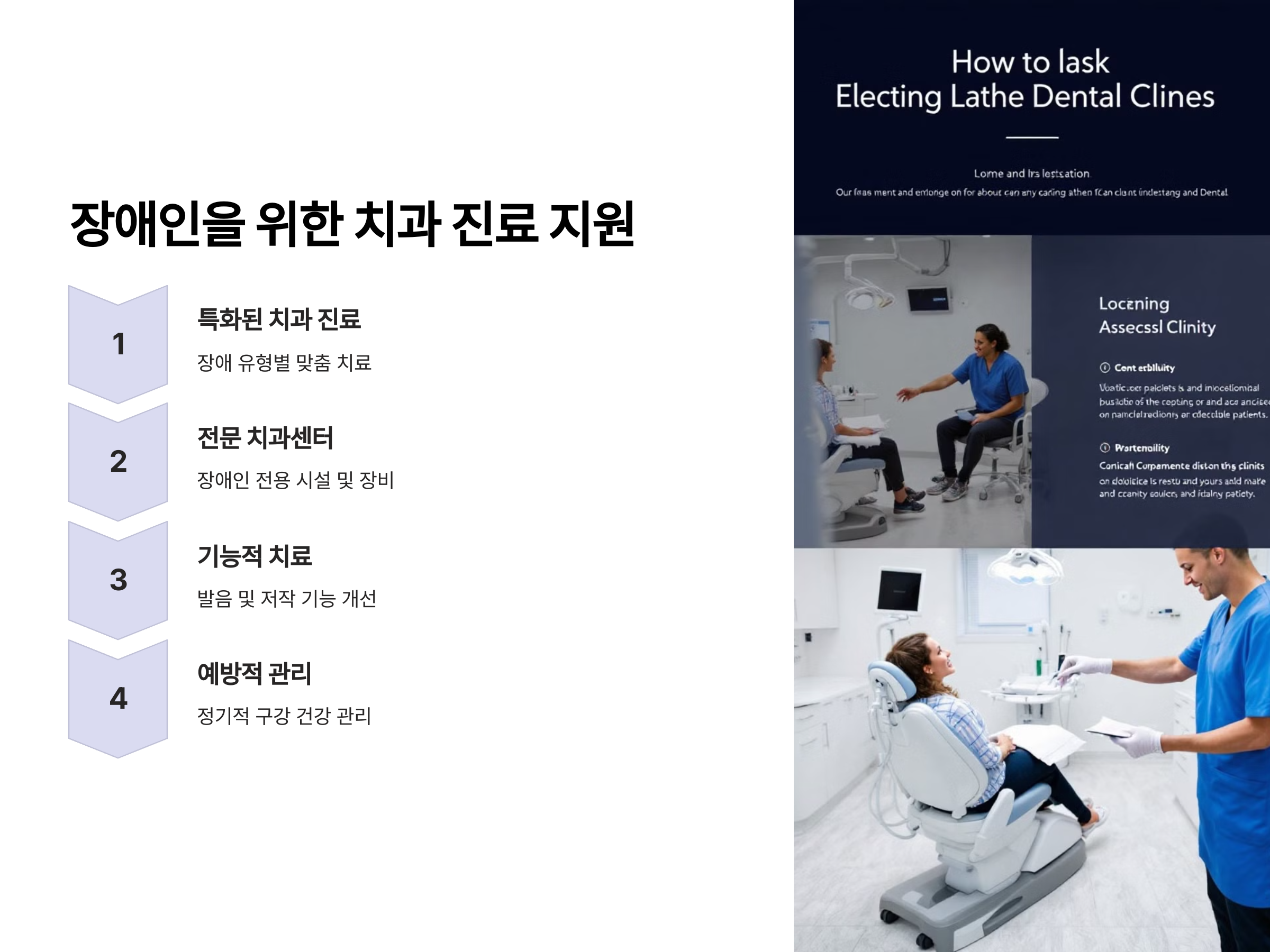장애인들은 일반적인 치과 치료를 받는 데 어려움이 많습니다. 장애의 유형에 따라 필요한 치료가 달라지고, 치료를 받기 위해 특별한 장비나 시설이 필요할 수 있기 때문입니다. 그래서 정부는 장애인들에게 특화된 치과 진료 지원을 제공하고 있습니다.