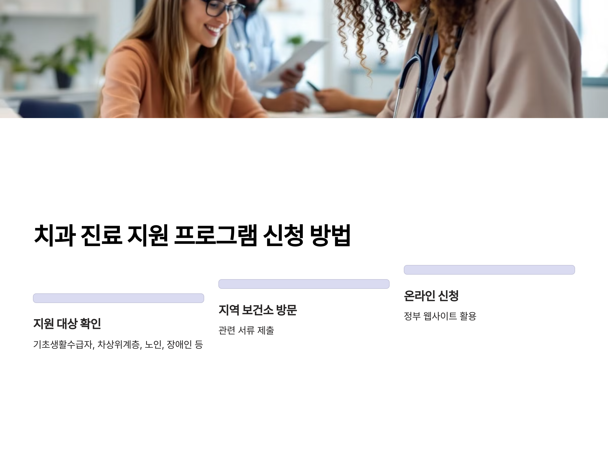 치과 진료 지원을 받기 위한 방법은 각 지역 보건소나 병원을 통해 신청할 수 있습니다. 지원을 받으려면 먼저 자신의 상황에 맞는 지원 대상자에 해당하는지 확인해야 합니다. 예를 들어, 기초생활수급자나 차상위계층으로 등록되어 있거나, 노인, 장애인 등 특정 조건을 충족해야 지원을 받을 수 있습니다.