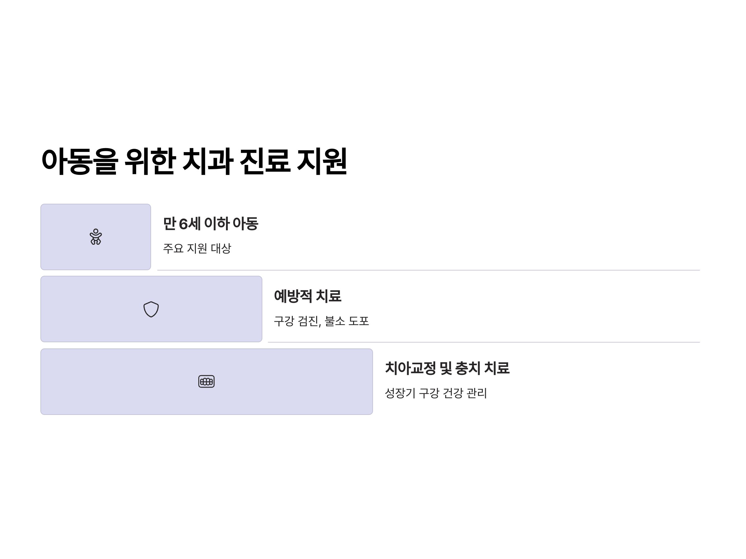 아동의 경우, 어린 시절에 치아 건강을 제대로 관리하지 않으면 성장 과정에서 치아 문제가 발생할 가능성이 큽니다. 이에 따라 정부는 아동들에게 무료 혹은 저렴한 비용으로 치과 진료를 제공하는 제도를 운영하고 있습니다. 특히, 유치나 치아교정, 충치 치료 등 다양한 치과 치료가 지원됩니다.