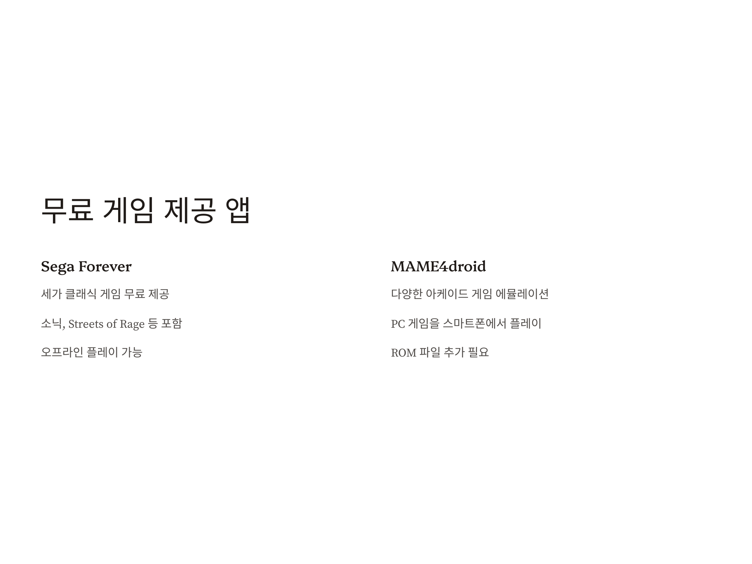 많은 앱이 아케이드 클래식 게임을 제공하지만, 그 중에서도 특히 무료로 제공되는 게임들을 소개해 드릴게요. 이 앱들에서 제공되는 게임들은 대부분 광고나 일부 인앱 결제를 제외하고는 무료로 이용할 수 있습니다.