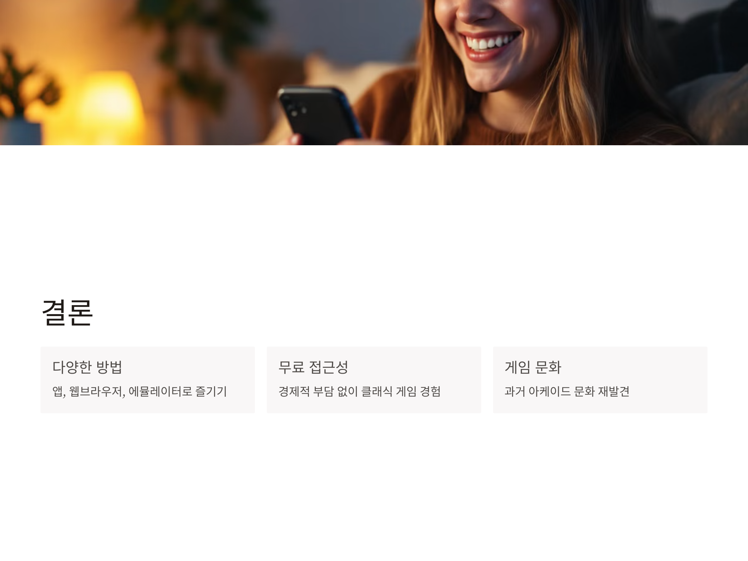 웹 브라우저에서 고전적인 아케이드 게임을 실행할 수 있는 사이트들이 많이 존재합니다. 대표적으로 "Internet Archive"와 같은 사이트에서는 고전적인 아케이드 게임을 웹상에서 바로 즐길 수 있는 서비스를 제공합니다. 이들 사이트는 HTML5를 지원하여, 브라우저만 있으면 별도의 앱 다운로드 없이도 게임을 즐길 수 있습니다.