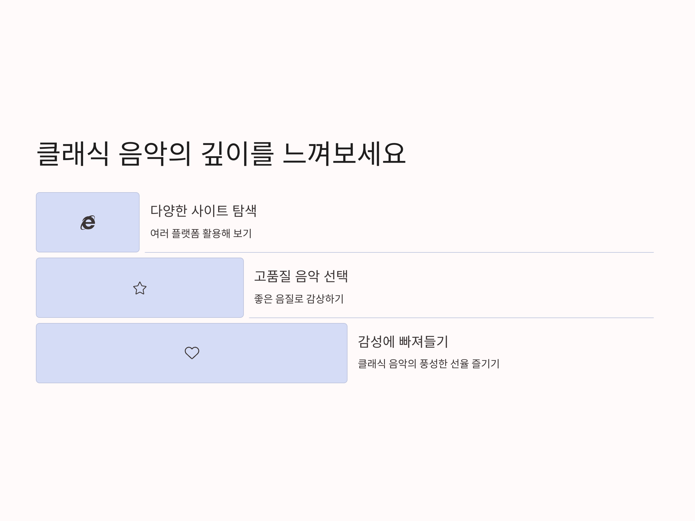 클래식 음악을 좋아하는 사람이라면 클래식 포레스트는 놓칠 수 없는 무료 음악 스트리밍 서비스입니다. 이 사이트는 각종 클래식 음반을 온라인으로 무료로 스트리밍 할 수 있도록 지원하며, 다양한 아티스트의 연주와 함께 클래식 음악의 깊이를 느낄 수 있습니다. 또한, 고음질의 스트리밍을 제공하므로 오디오 품질에 민감한 사용자들도 만족할 수 있습니다. 클래식 포레스트에서는 다양한 고전적 작품뿐만 아니라 현대 클래식 음악도 감상할 수 있어 더욱 다채로운 클래식 음악 세계를 경험할 수 있습니다.