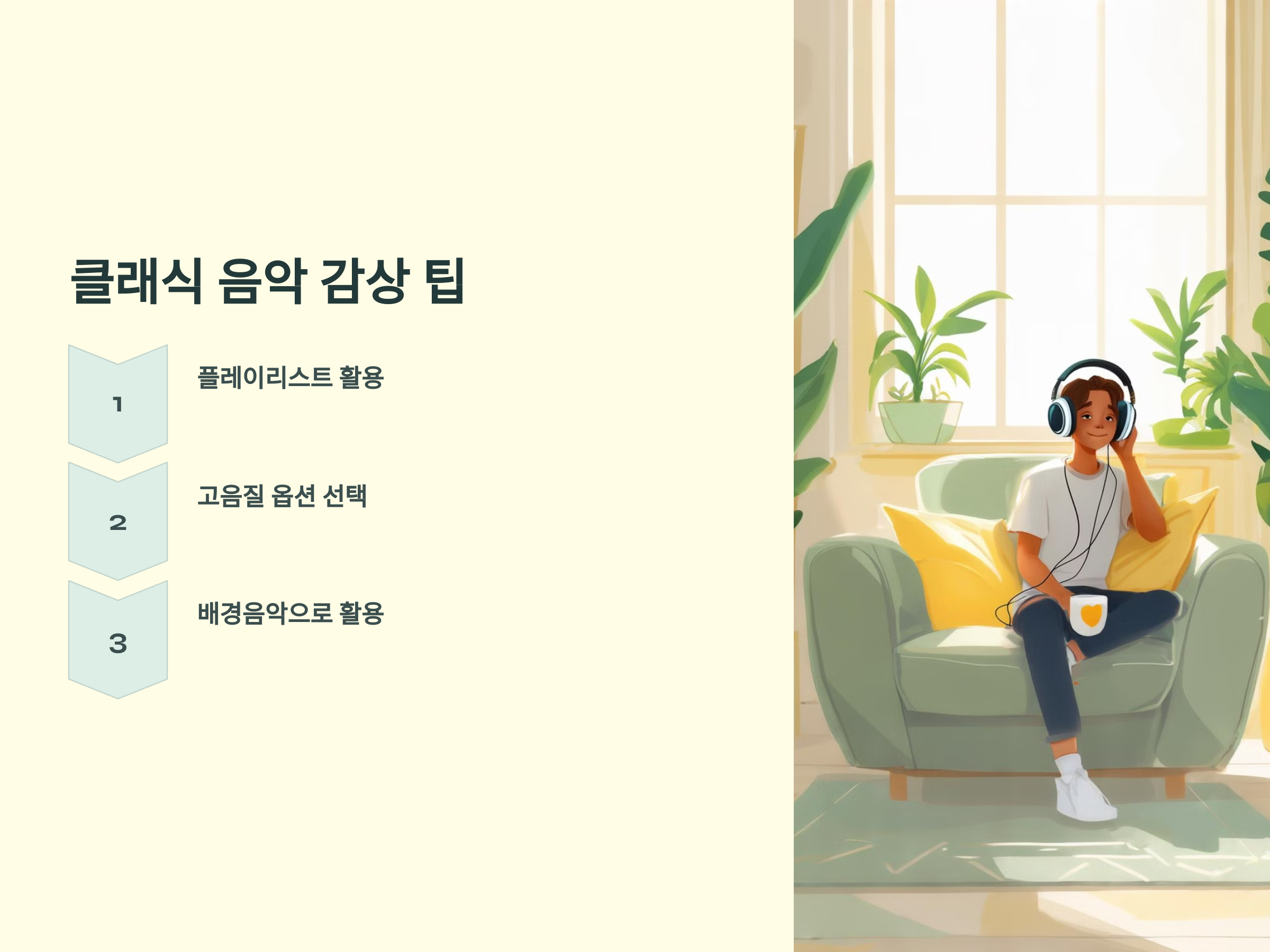 클래식 음악은 음질이 중요한 장르입니다. 대부분의 무료 서비스는 기본 음질을 제공하지만, 고음질 옵션을 선택할 수 있는 서비스도 있습니다. 가능한 한 고음질로 음악을 감상하면, 악기의 세밀한 음색과 디테일을 더 잘 느낄 수 있습니다.