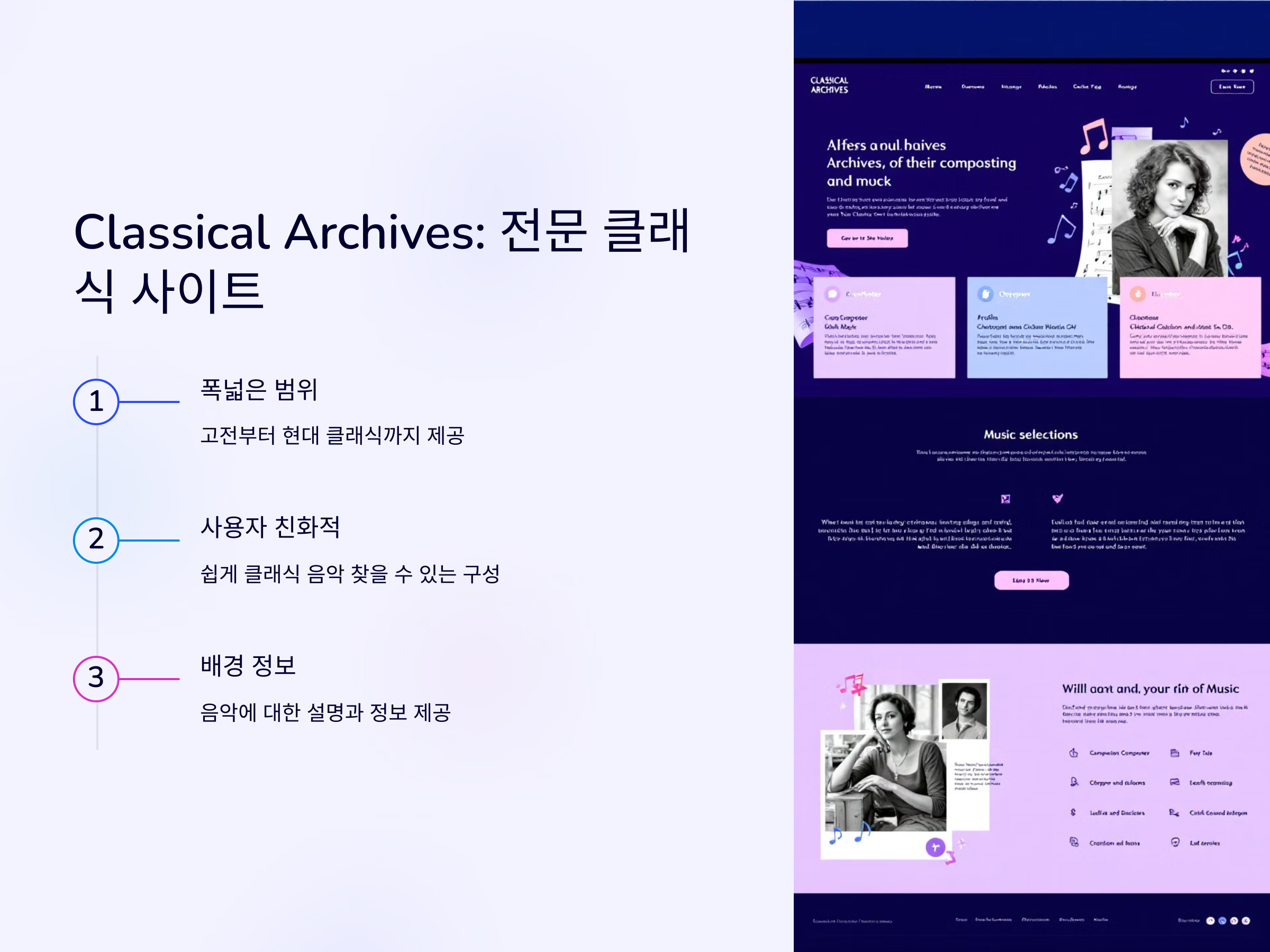 Classical Archives는 클래식 음악을 전문적으로 다루는 사이트입니다. 이곳에서는 고전적인 작품부터 현대의 클래식까지 폭넓은 범위의 클래식 음악을 무료로 감상할 수 있습니다. 사이트는 사용자가 쉽게 클래식 음악을 찾을 수 있도록 구성되어 있으며, 전 세계의 유명 작곡가들의 작품들을 손쉽게 감상할 수 있는 플랫폼을 제공합니다. 또한, 클래식 음악에 대한 설명과 배경 정보도 함께 제공되어, 음악을 들으며 더욱 깊이 있는 경험을 할 수 있습니다.