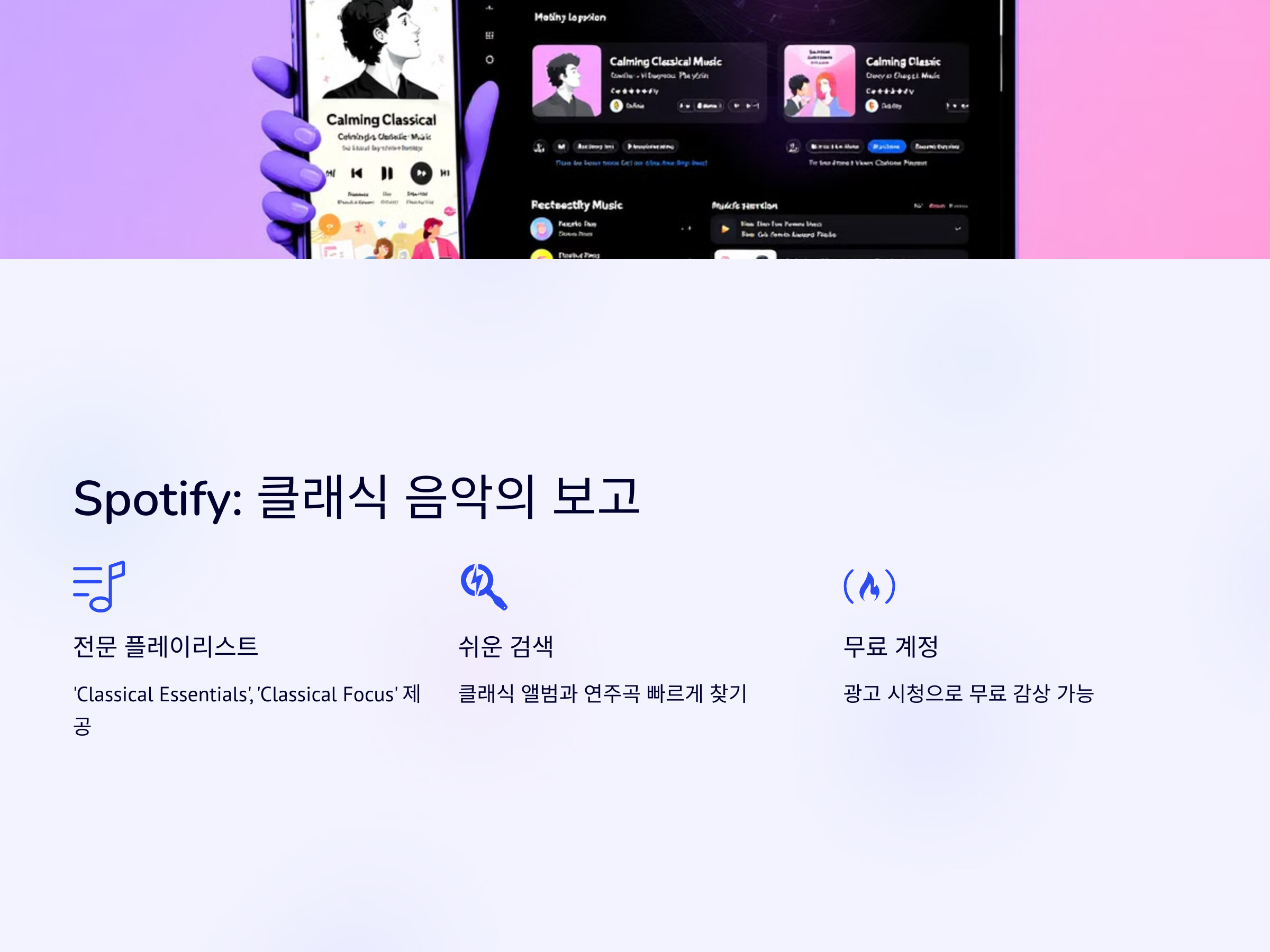 Spotify는 음악 스트리밍 서비스의 거대 플랫폼으로, 클래식 음악도 잘 제공됩니다. 무료 계정을 만들면 광고가 나오는 대신 클래식 음악을 마음껏 감상할 수 있어요. 클래식 앨범이나 연주곡을 쉽게 찾을 수 있으며, 다양한 클래식 음악 플레이리스트도 제공되고 있습니다. 특히 'Classical Essentials'와 'Classical Focus'와 같은 전문적인 테마 플레이리스트 덕분에, 상황에 맞는 클래식을 쉽게 찾을 수 있습니다.