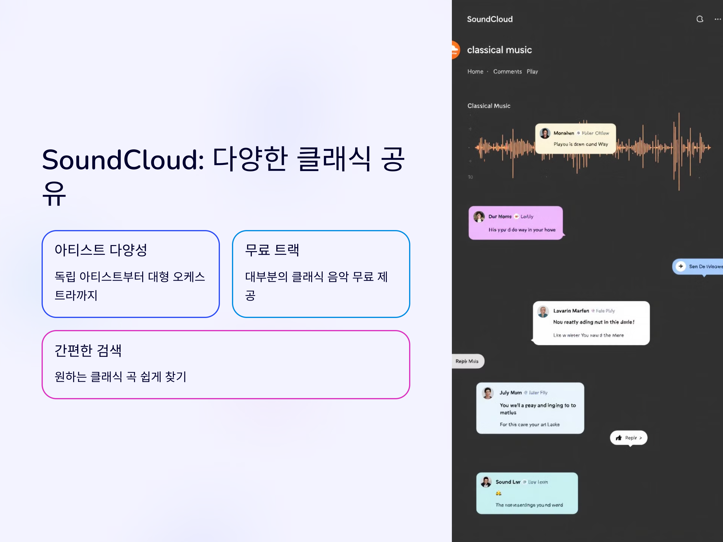 SoundCloud는 음악 공유 플랫폼으로, 다양한 아티스트들이 자신의 작품을 업로드하는 곳입니다. 클래식 음악도 마찬가지로 수많은 클래식 음악들이 공유되고 있으며, 독립적인 아티스트부터 대형 오케스트라의 공연까지 다양하게 제공됩니다. 대부분의 트랙은 무료로 들을 수 있고, 원하시는 클래식 곡을 직접 검색하여 찾아듣기도 쉽습니다.