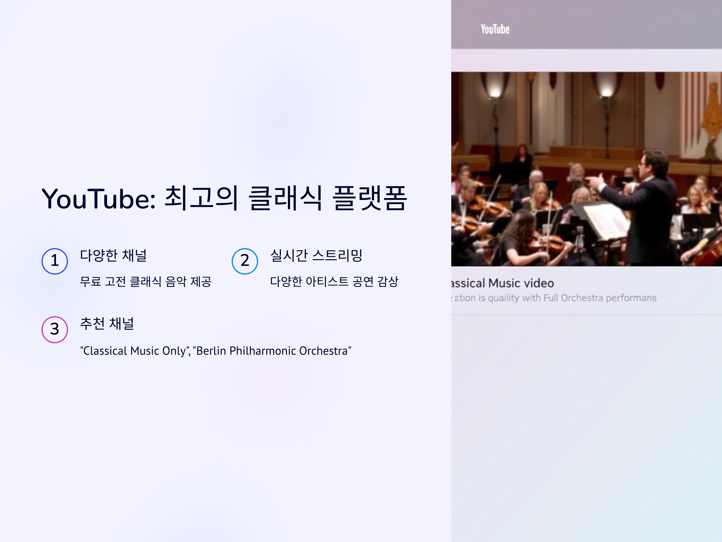 YouTube는 모든 종류의 음악을 찾을 수 있는 최고의 플랫폼 중 하나입니다. 클래식 음악도 예외는 아니죠. 많은 채널에서 무료로 고전 클래식 음악을 제공하고 있으며, 심지어 다양한 아티스트들의 공연을 실시간 스트리밍으로 감상할 수도 있습니다. 예를 들어 "Classical Music Only"나 "Berlin Philharmonic Orchestra" 채널에서는 유명한 클래식 음악과 그에 맞는 고화질 영상을 함께 제공합니다. 또한, 다양한 연주 스타일을 비교하며 즐길 수 있다는 점에서 매우 유용합니다.