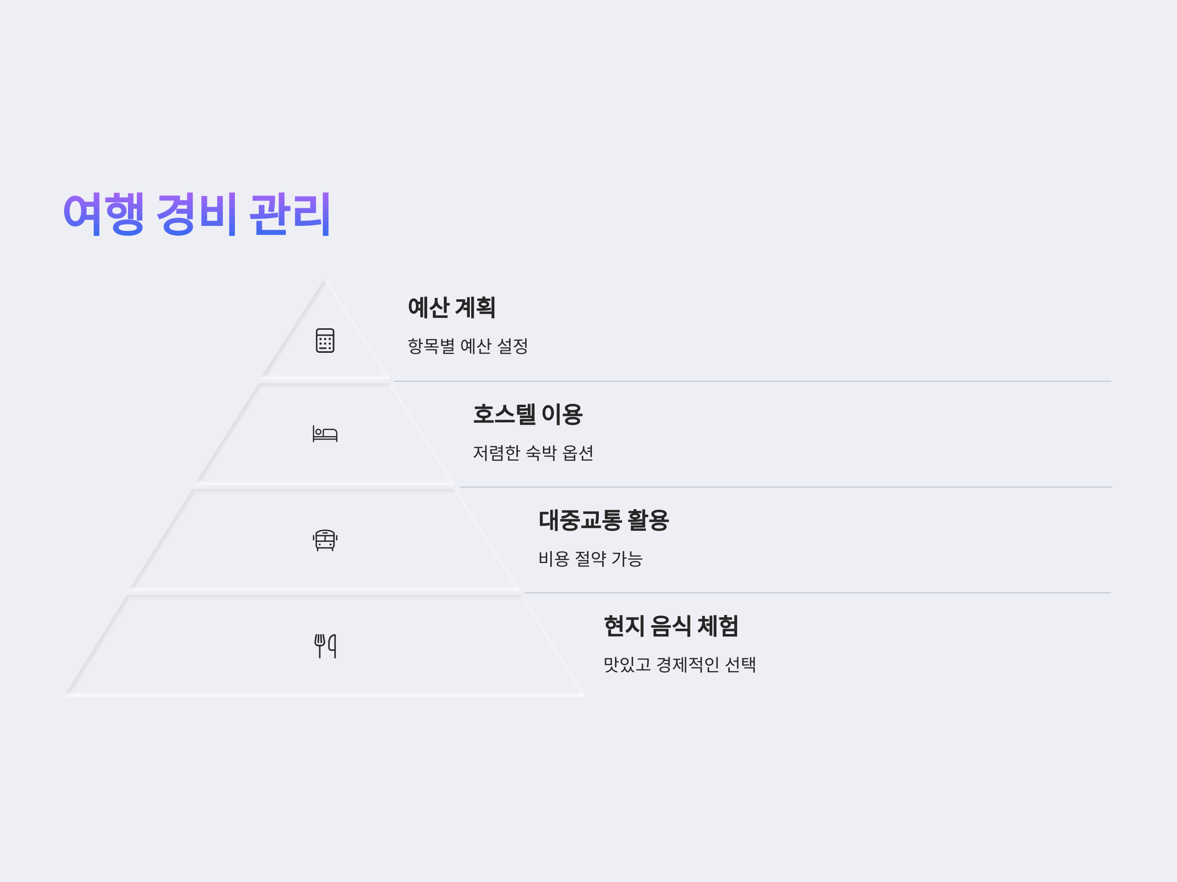 - 로컬 음식: 현지 음식은 맛도 좋고 가격도 저렴합니다. 관광지 주변의 비싼 레스토랑보다는 현지 사람들이 자주 가는 식당을 이용해 보세요.