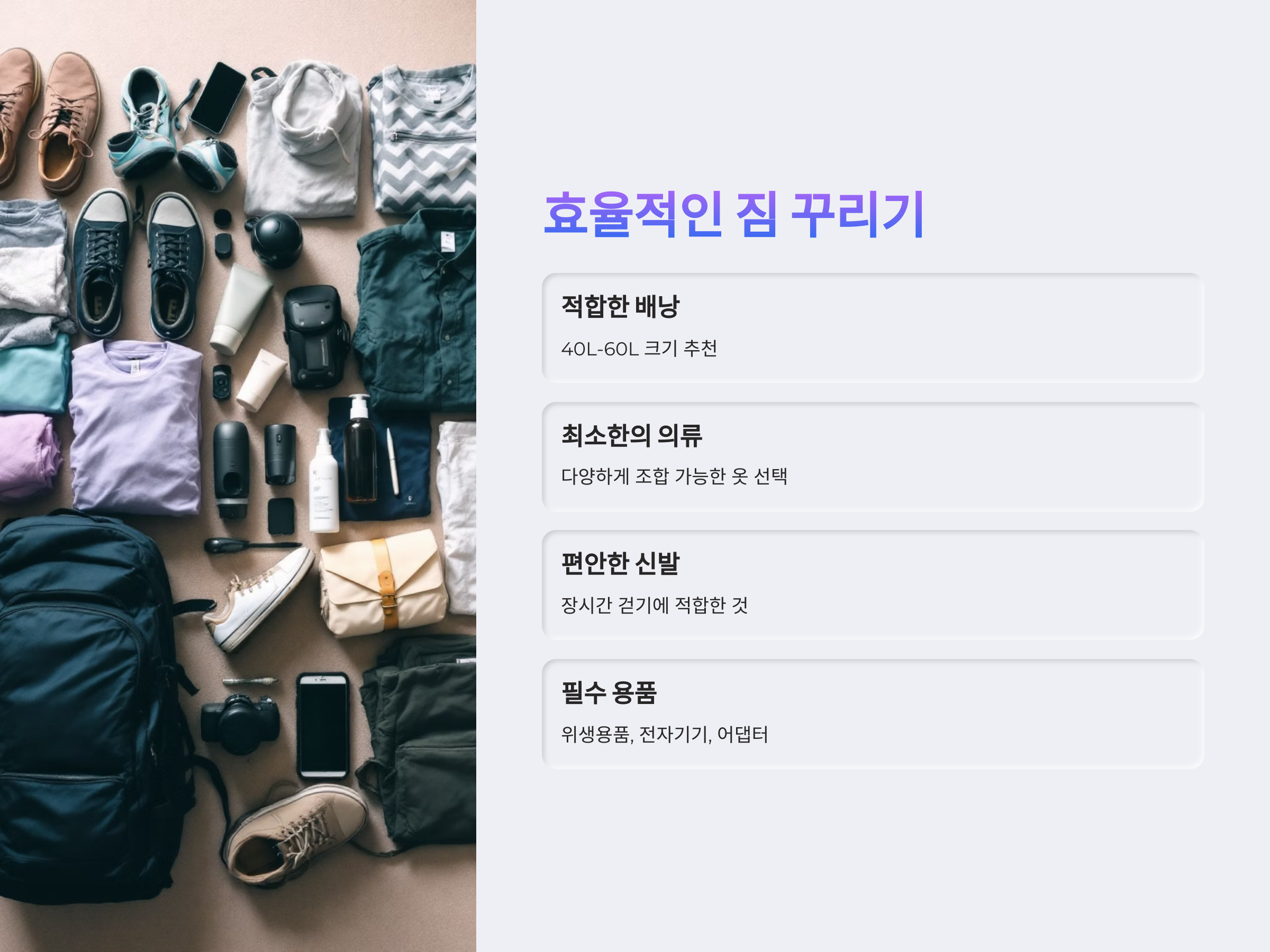 - 배낭: 40L에서 60L 정도의 배낭이 가장 적합합니다. 너무 작은 배낭은 짐을 다 담기 힘들고, 너무 큰 배낭은 무겁고 불편합니다.
