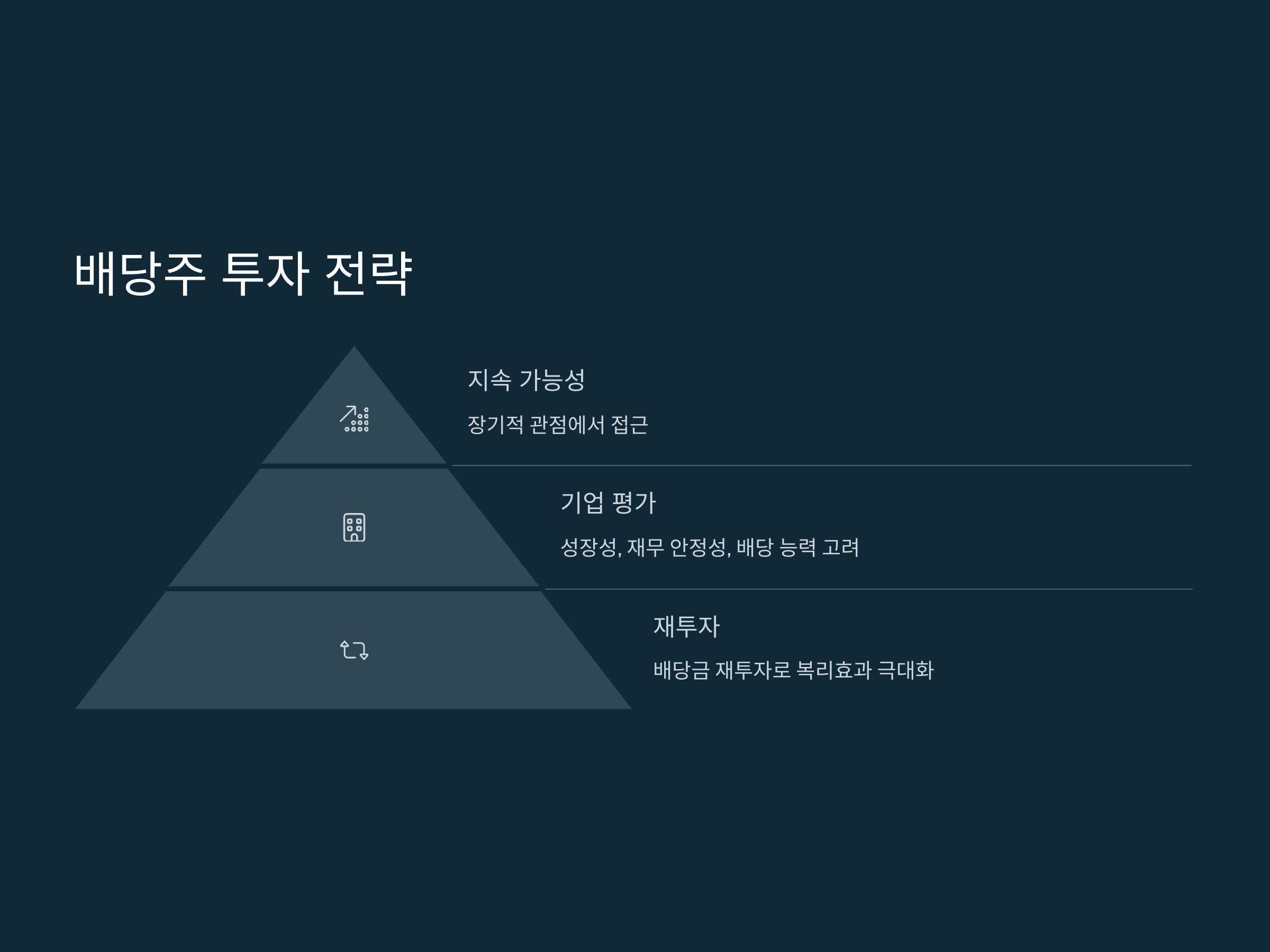 배당주 투자에서 가장 중요한 점은 "지속 가능성"입니다. 배당주에 투자하여 안정적인 수익을 얻으려면, 기업의 성장성, 재무 안정성, 배당 지급 능력 등을 종합적으로 고려해야 합니다. 특히, 배당금이 지속적으로 증가하는 기업에 투자하는 것이 바람직합니다. 이와 같은 기업들은 경제 상황에 관계없이 안정적인 현금 흐름을 제공할 가능성이 높습니다.