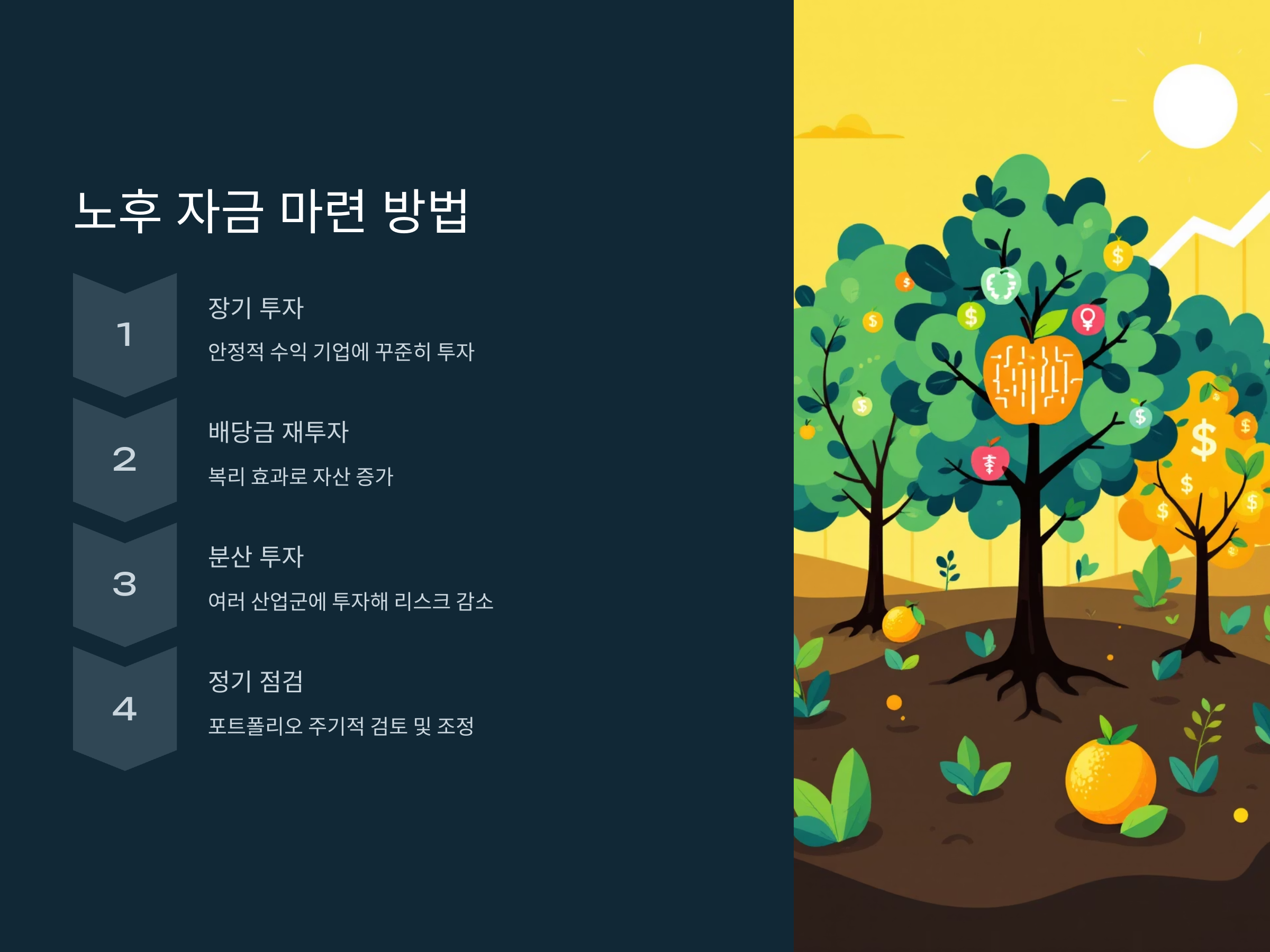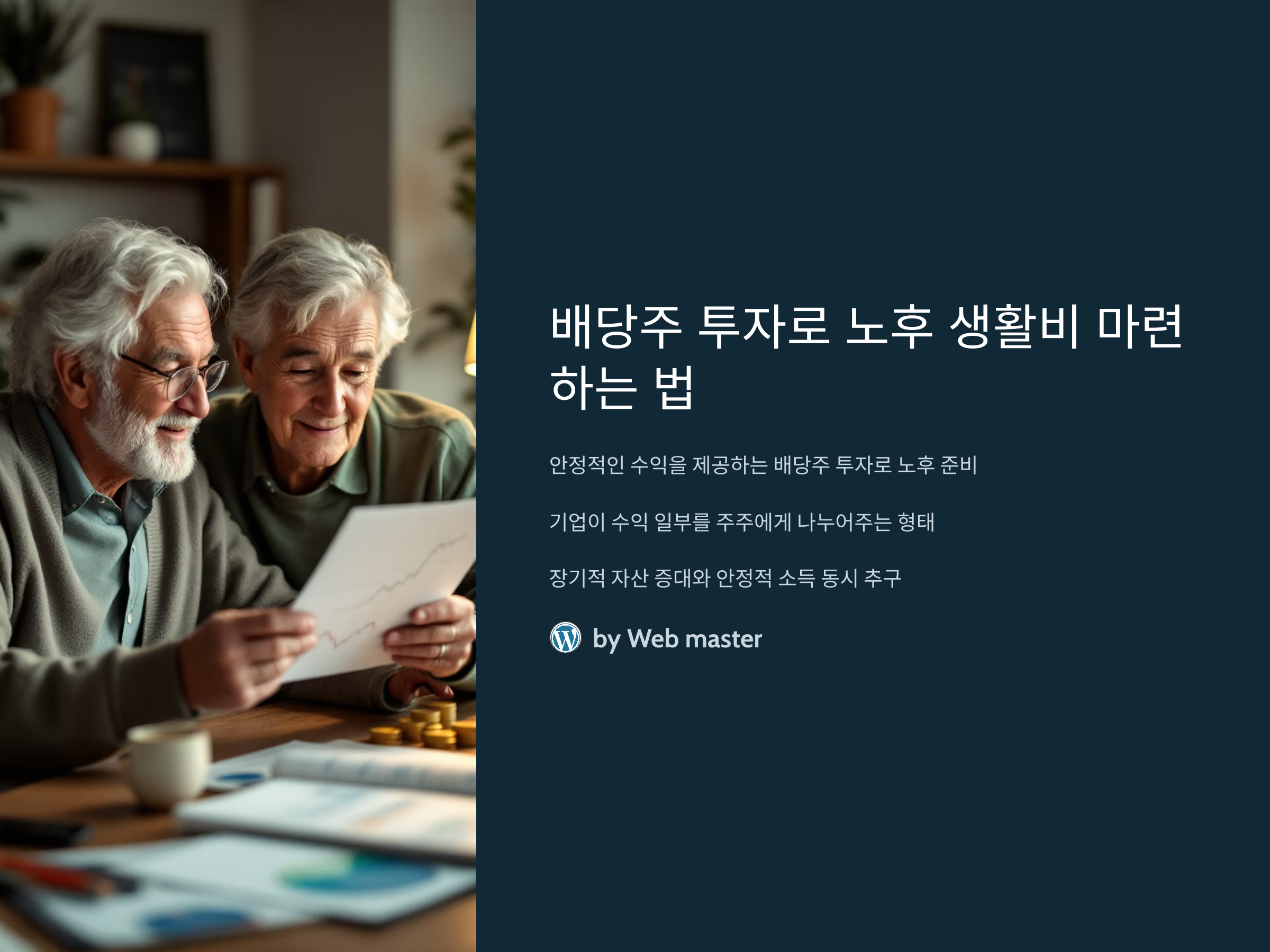 배당주 투자는 노후 자금을 마련하는 데 있어 매우 유효한 전략입니다. 안정적인 배당금을 꾸준히 받으면서 장기적인 자산 성장을 기대할 수 있기 때문입니다. 그러나 배당주에 투자할 때는 기업의 재무 안정성, 배당금의 지속 가능성 등을 충분히 검토하고, 분산 투자와 재투자를 통해 리스크를 줄여야 합니다.
