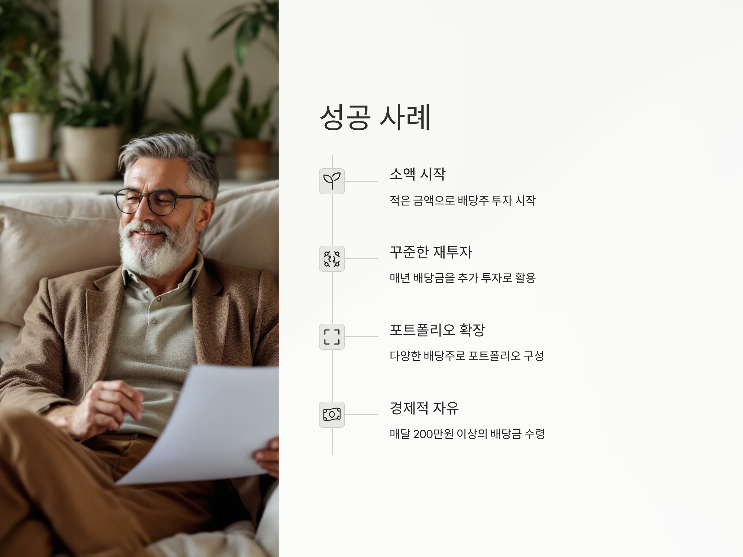 한 예로, 한 투자자는 10년 동안 꾸준히 배당주에 투자하여, 현재 매달 200만 원 이상의 배당금을 수령하고 있습니다. 이 사람은 처음에는 소액으로 시작했지만, 매년 배당금을 재투자하며 꾸준히 포트폴리오를 확장했습니다. 결국 안정적인 배당금을 받는 것은 물론, 자산 가치가 증가하여 경제적 자유를 실현하게 되었습니다.