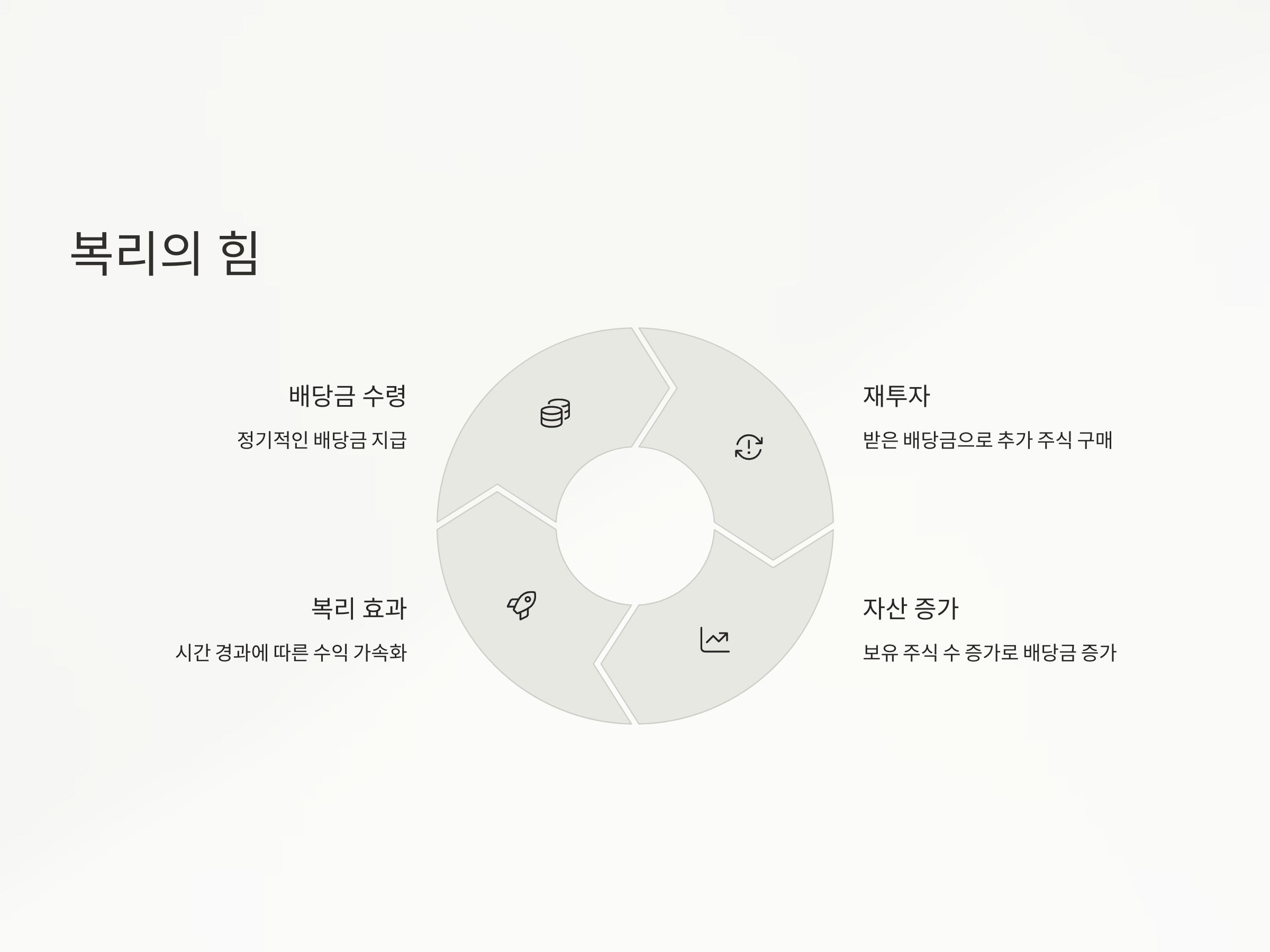 이 방식은 복리 효과를 통해 시간이 지날수록 자산이 빠르게 증가하는 효과를 가져옵니다. 배당금이 재투자될수록 배당금 자체도 증가하고, 이로 인해 장기적으로 더욱 안정적이고 높은 수익을 얻을 수 있습니다.