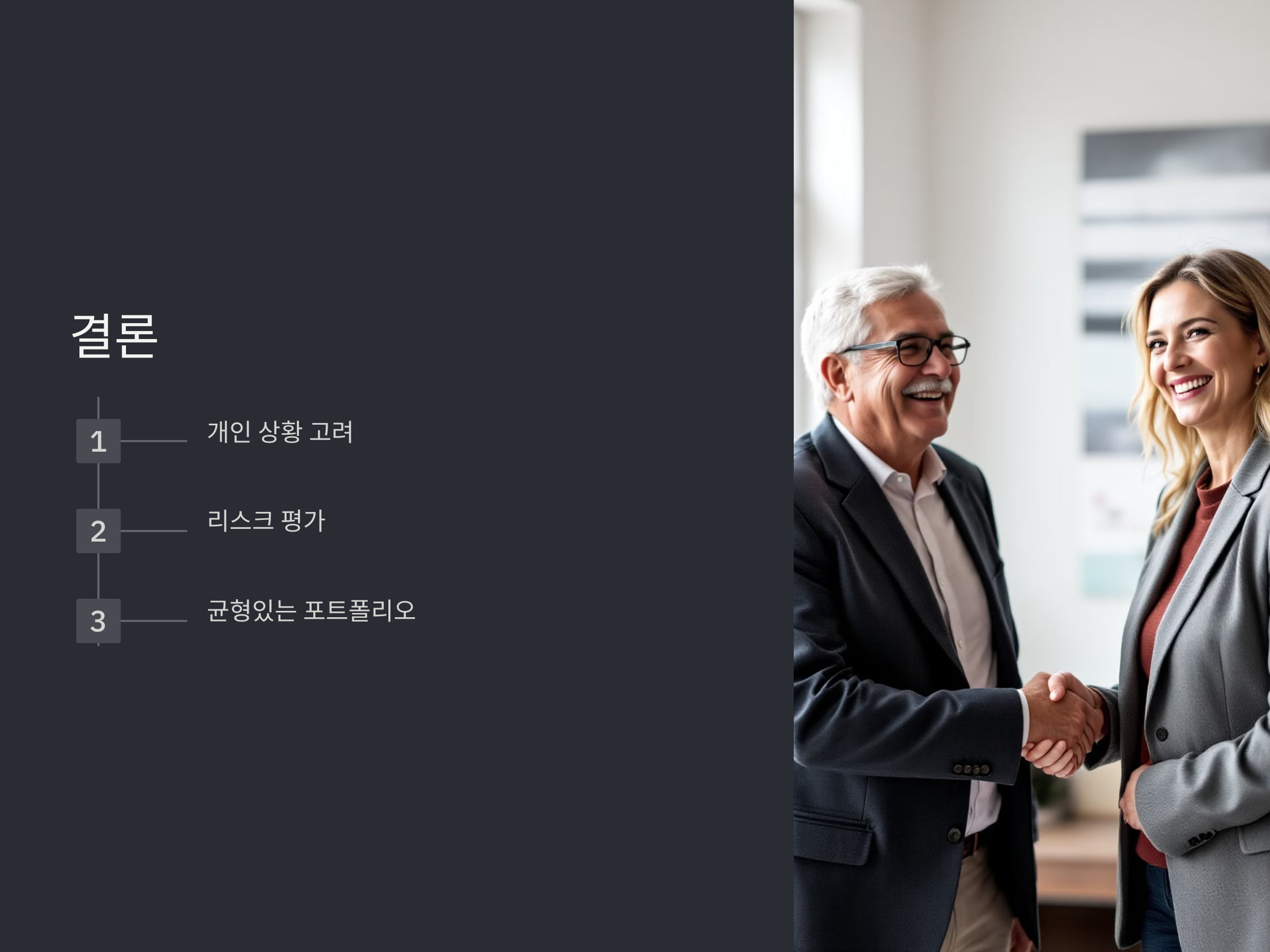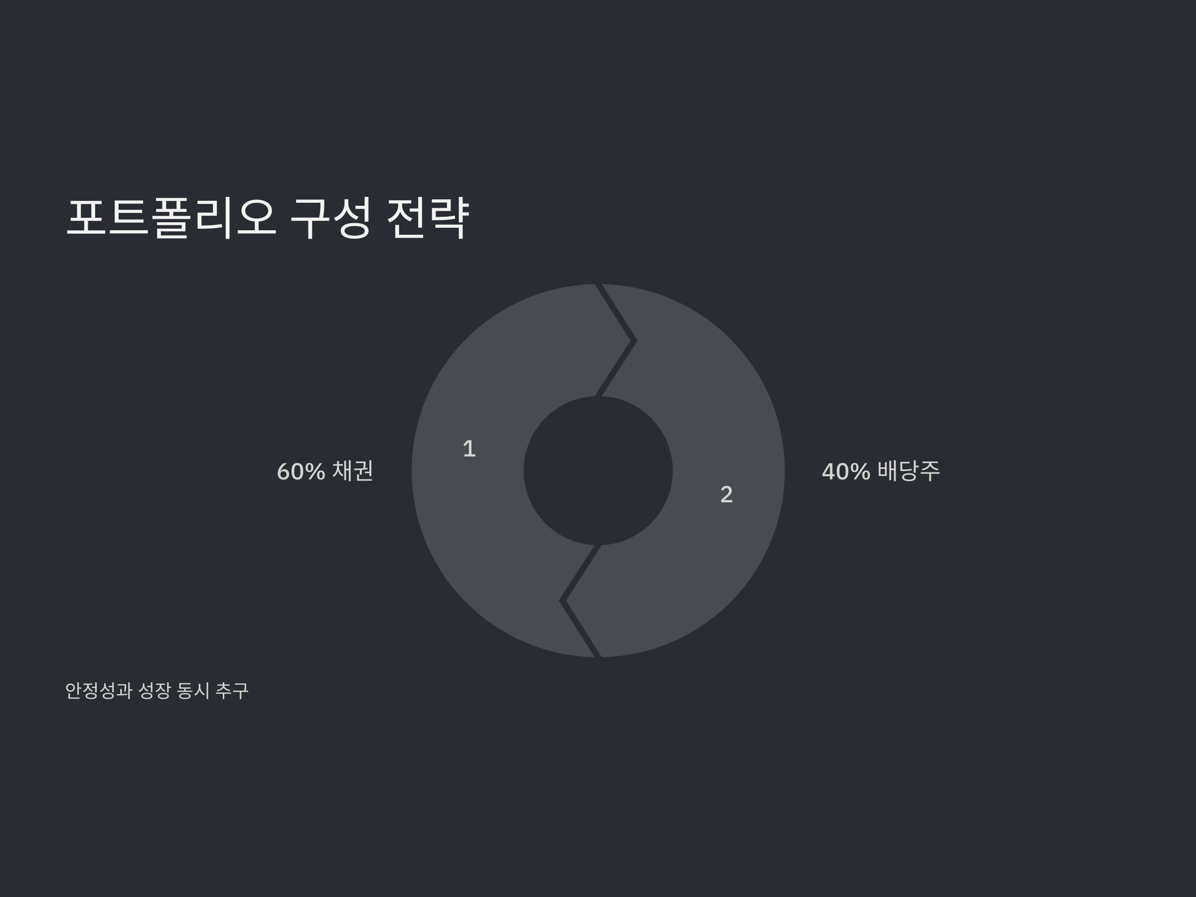 - 60% 채권 + 40% 배당주: 안정적인 현금 흐름을 제공하는 채권에 비중을 두고, 추가적인 성장 잠재력을 기대할 수 있는 배당주를 적절히 배치하는 전략입니다.