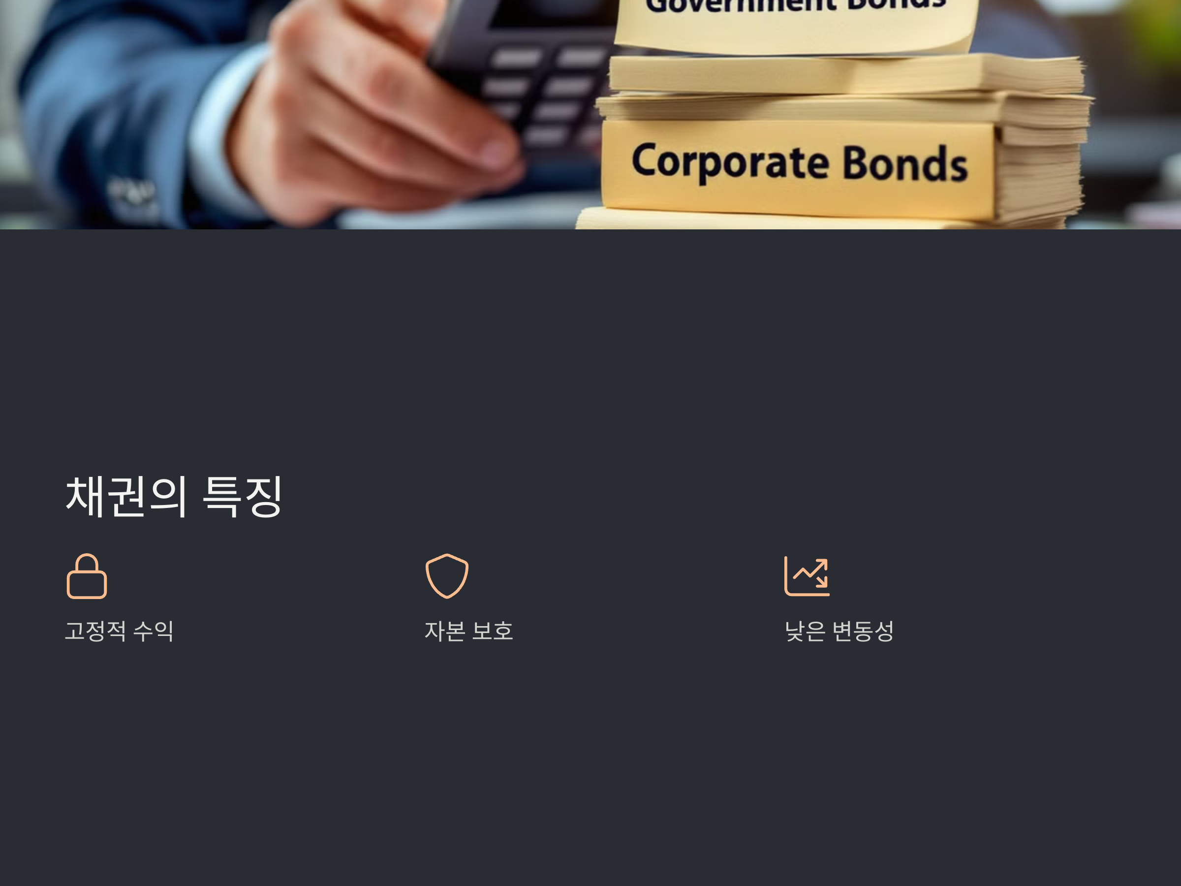 채권은 정부나 기업이 발행하는 증서로, 일정 기간 동안 고정된 이자를 지급받고 만기일에 원금을 돌려받는 투자 상품입니다. 채권은 주식보다 상대적으로 안정적인 수익을 제공하며, 대부분의 경우 주식에 비해 리스크가 낮습니다.