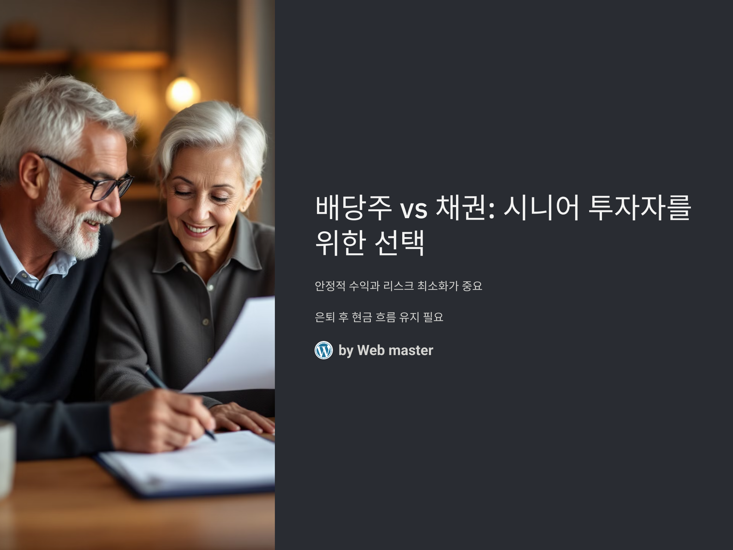 시니어 투자자에게는 채권이 더 안정적인 수익을 제공하므로 적합할 수 있습니다. 하지만 배당주도 일정한 수익을 제공하므로, 상황에 맞게 포트폴리오에 포함시킬 수 있습니다.