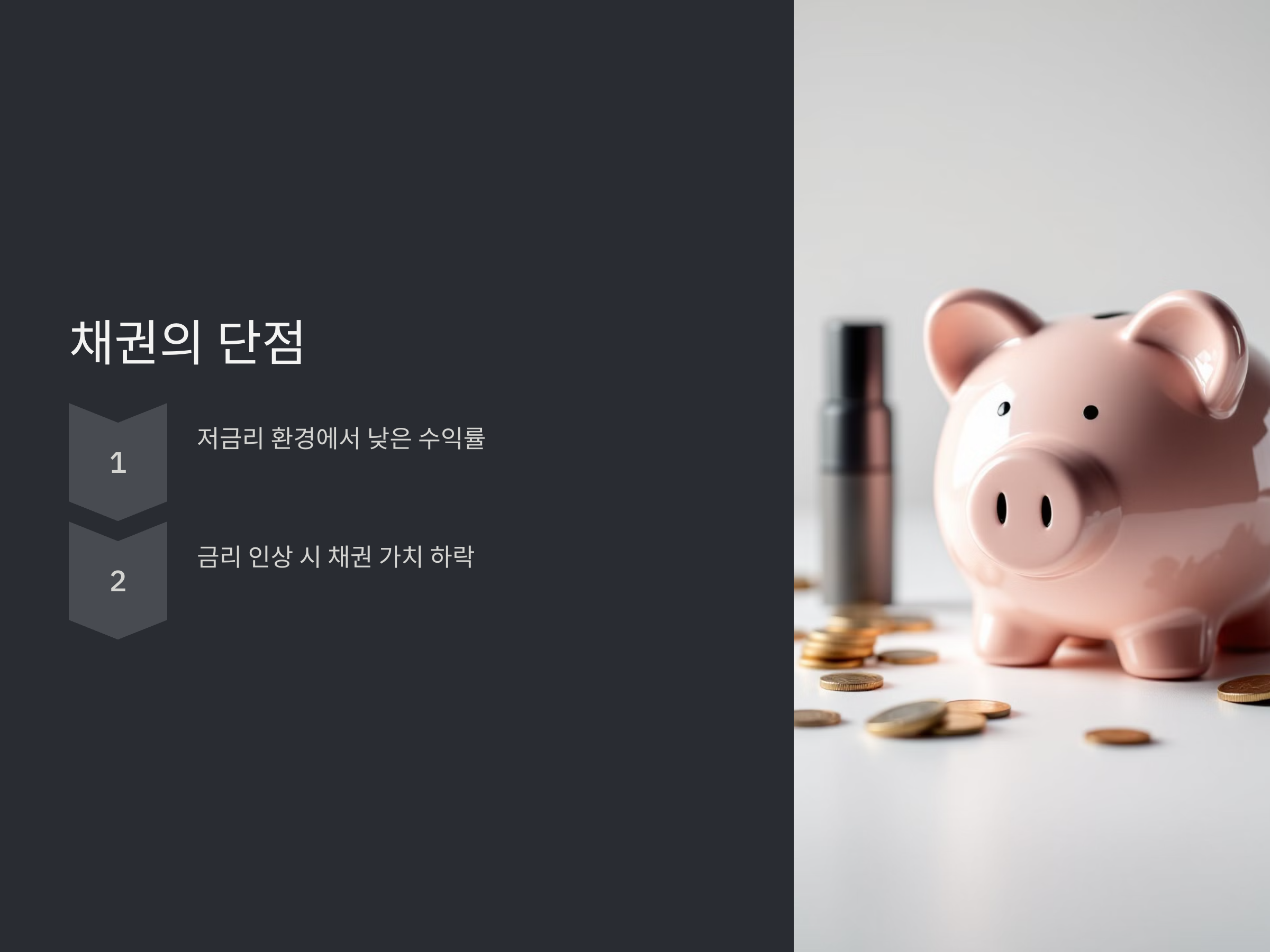 - 시장 변동성 낮음: 주식보다 변동성이 적고, 금리가 일정 기간 동안 고정되기 때문에 시장의 급변동에 덜 영향을 받습니다.