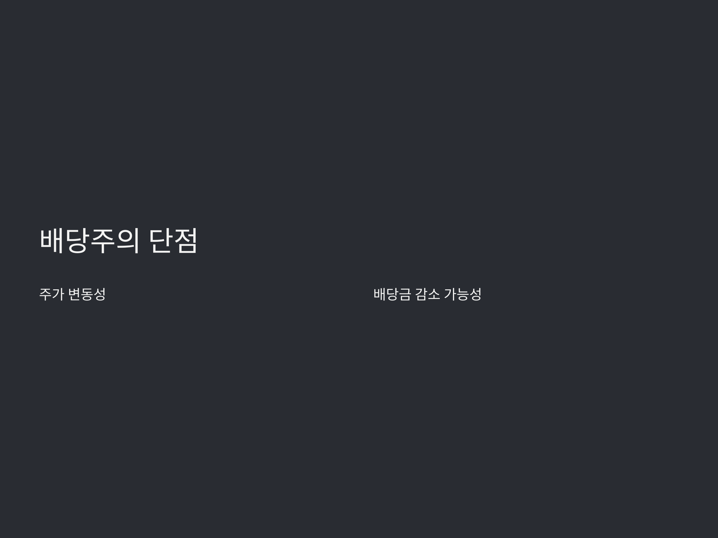 - 주가 변동성: 배당주도 주식이기 때문에 주식 시장의 변동성에 영향을 받습니다. 주식 가격이 급락하면, 배당금 지급도 중단될 수 있습니다.