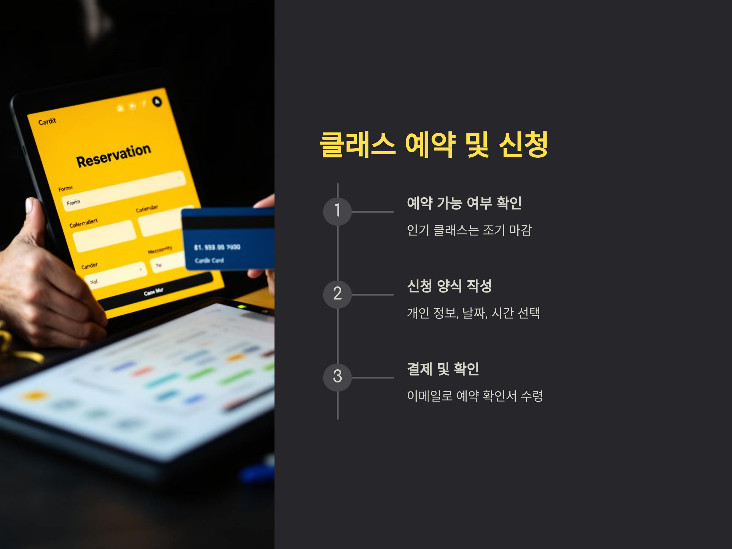 - 신청 양식 작성: 대부분의 클래스는 온라인 예약 양식을 작성해야 합니다. 개인 정보와 함께 원하는 날짜와 시간 등을 선택하세요.
