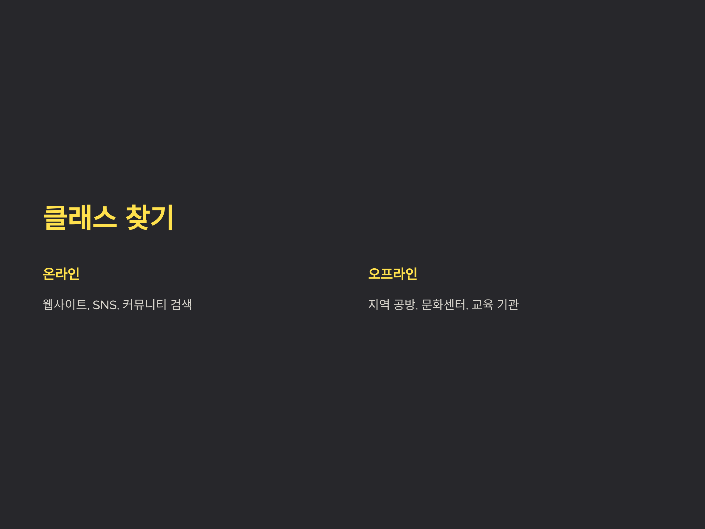 - 답: 온라인 클래스는 집에서 편안하게 참여할 수 있는 반면, 오프라인 클래스는 전문가와 직접 실습하며 배울 수 있는 장점이 있습니다. 둘 중 어떤 형식을 선택할지는 자신의 편의에 맞춰 결정하세요.