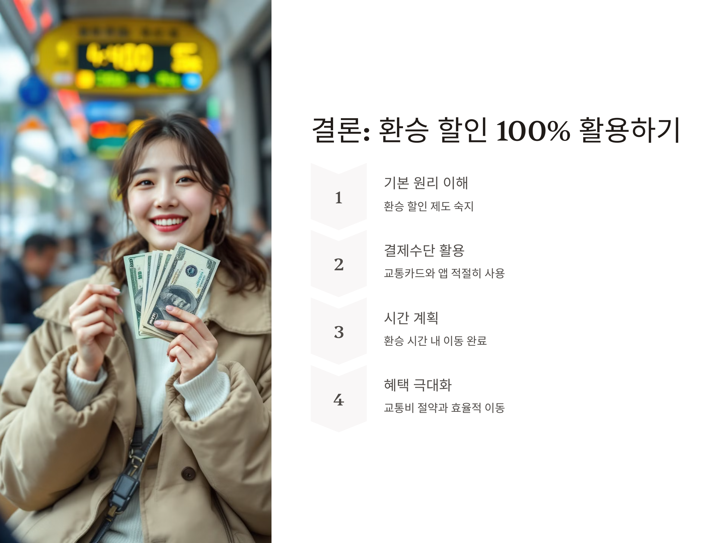 버스·지하철 환승 할인 제도는 비용을 절감하고, 효율적으로 대중교통을 이용할 수 있는 좋은 방법입니다. 환승 할인 혜택을 100% 활용하기 위해서는 제도의 기본 원리를 이해하고, 교통카드나 스마트폰 앱을 적절히 활용하는 것이 중요합니다. 또한 환승 시간 내에 이동을 마치도록 계획하고, 각종 프로모션을 적극적으로 활용하면 더 큰 혜택을 누릴 수 있습니다. 교통비를 절약하고 보다 효율적인 이동을 원한다면, 오늘부터 환승 할인 제도를 적극적으로 활용해 보세요.