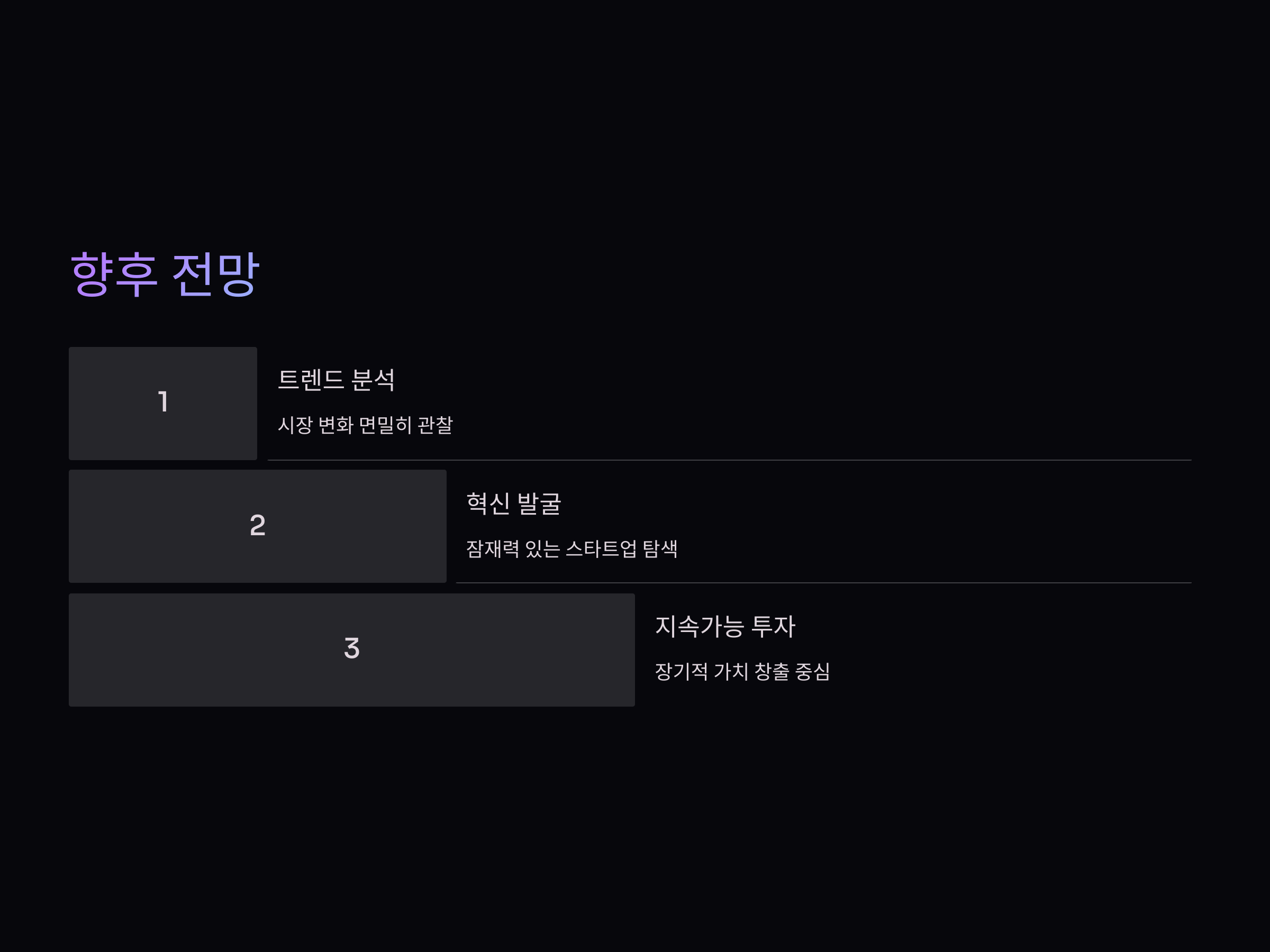 향후 투자자들은 이러한 트렌드를 면밀히 분석하고, 각 분야의 성장 가능성을 고려하여 투자 결정을 내릴 것입니다. 특히, 장기적인 지속 가능성에 중점을 두고, 혁신적인 스타트업을 발굴하는 데 집중할 필요가 있습니다.