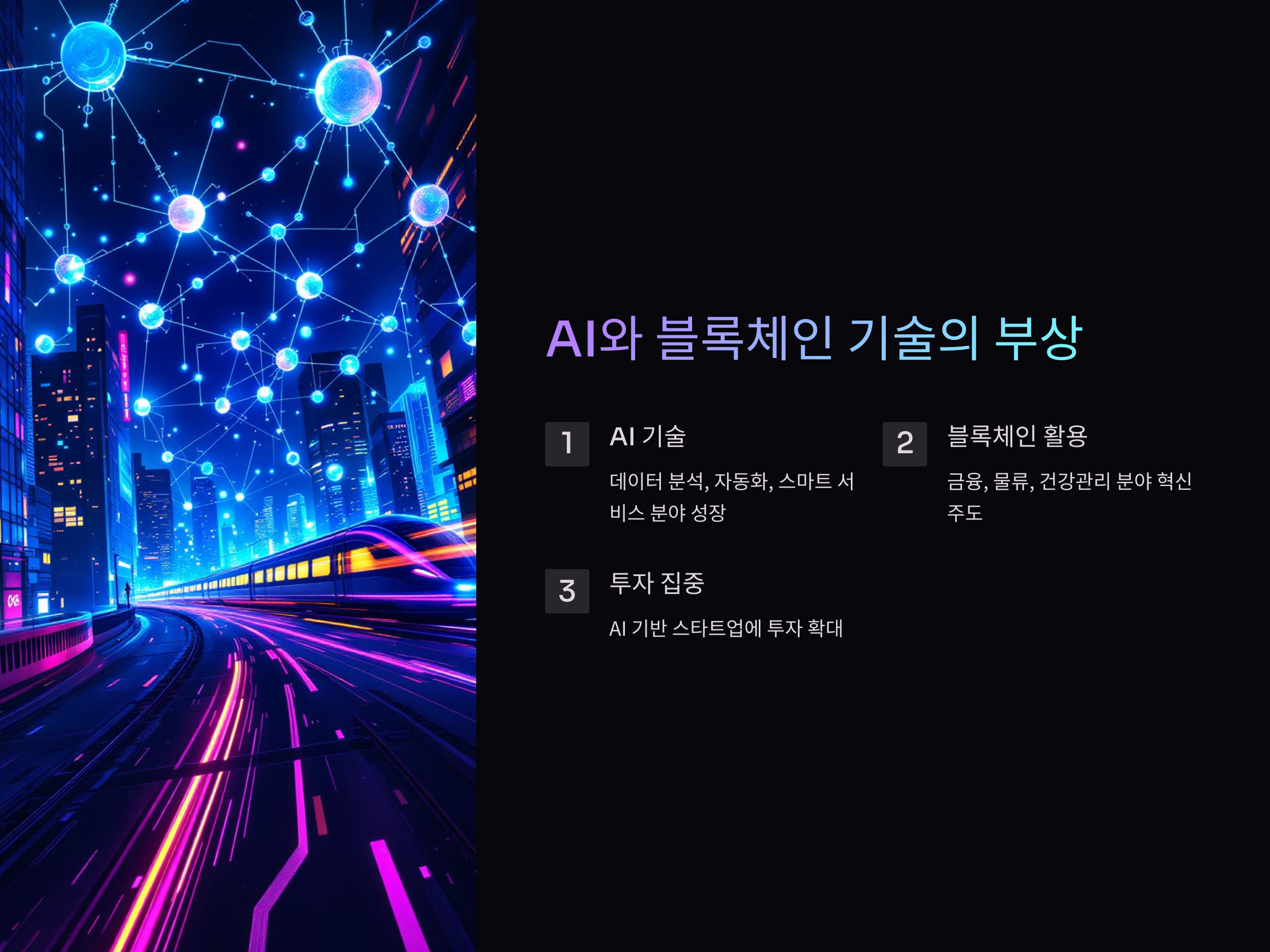2025년, 벤처캐피털의 주요 투자 분야는 인공지능(AI)과 블록체인 기술입니다. AI 기술은 이미 많은 산업에서 핵심적인 역할을 하고 있으며, 이제는 보다 고도화된 솔루션들이 등장하고 있습니다. 특히 데이터 분석, 자동화, 스마트 서비스 등 다양한 분야에서 AI의 활용 가능성은 무궁무진합니다. 이에 따라 VC 투자자들은 AI 기반 스타트업에 대한 투자에 더욱 집중할 것입니다.