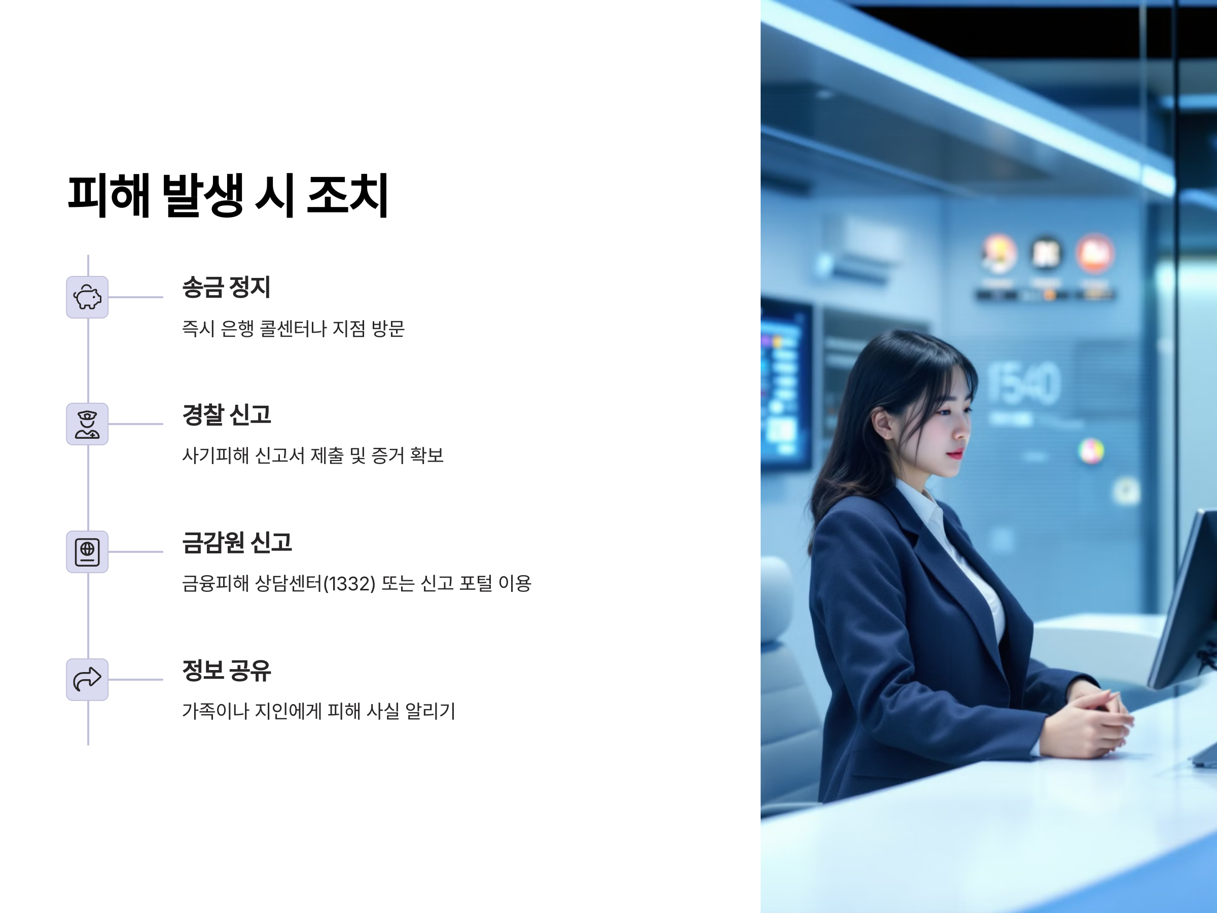 셋째, 금융감독원 금융피해 상담센터(1332) 또는 보이스피싱 신고 포털을 통해 관련 정보를 등록하세요. 피해금액 일부는 추후 반환될 수 있으므로 절대 포기하지 말고 정식 절차를 따르세요. 마지막으로 가족이나 지인들에게도 본인의 피해 사실을 공유하여 유사한 상황에 주의하도록 알리는 것이 중요합니다.